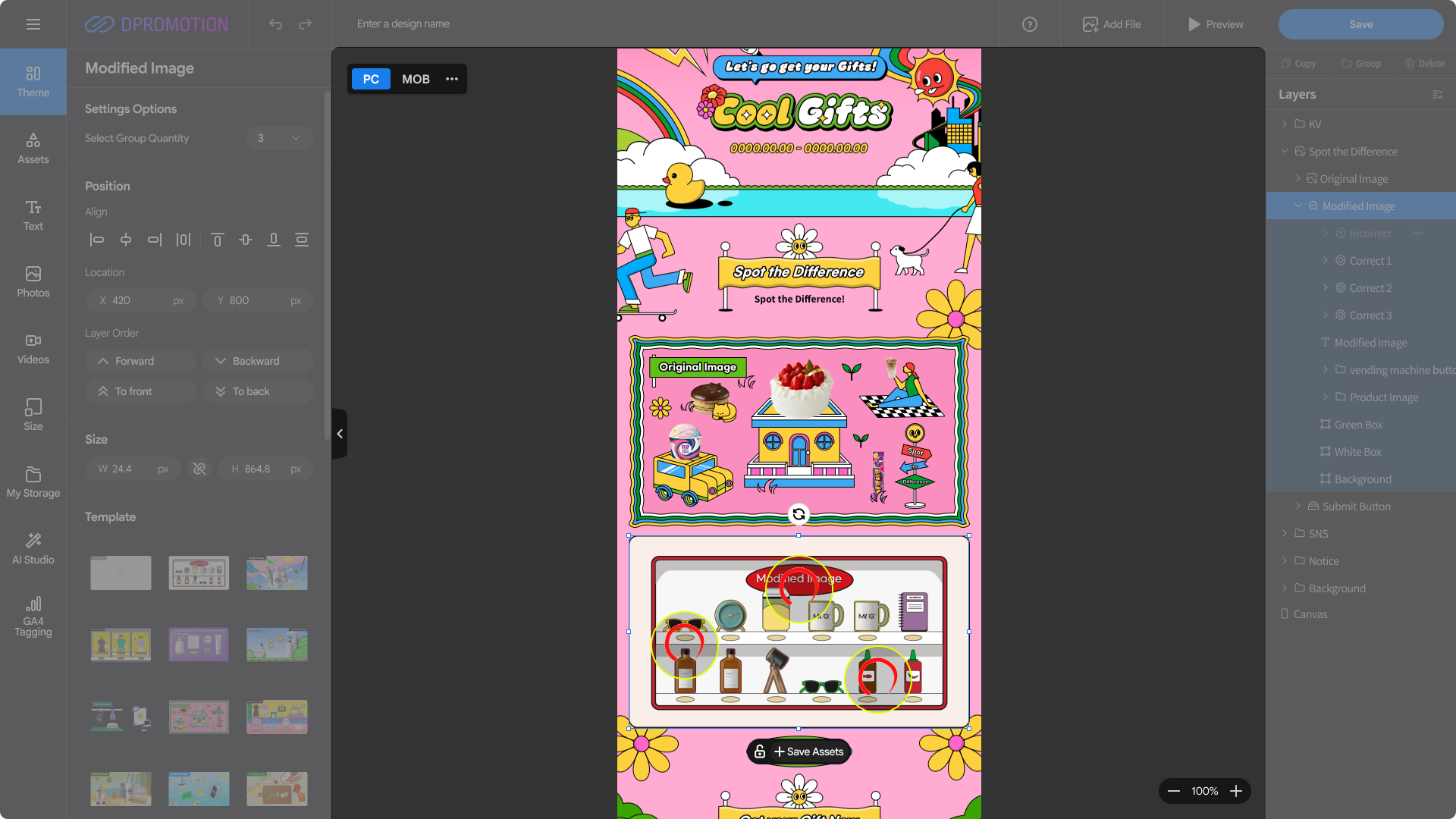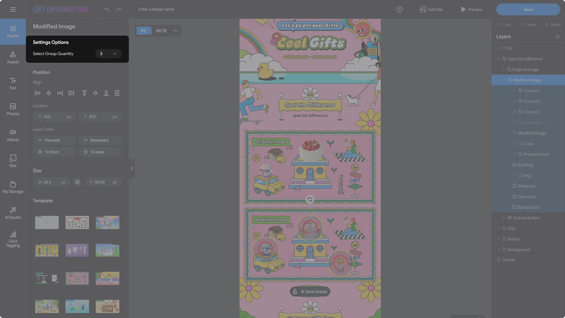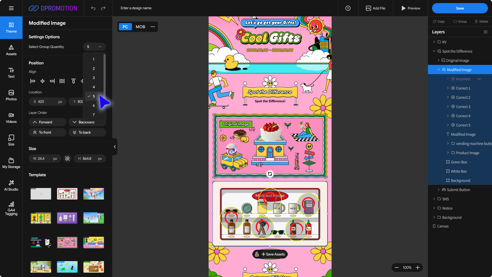 In Select Group Quantity, you can set the total number of correct answers for the Spot the Difference promotion.