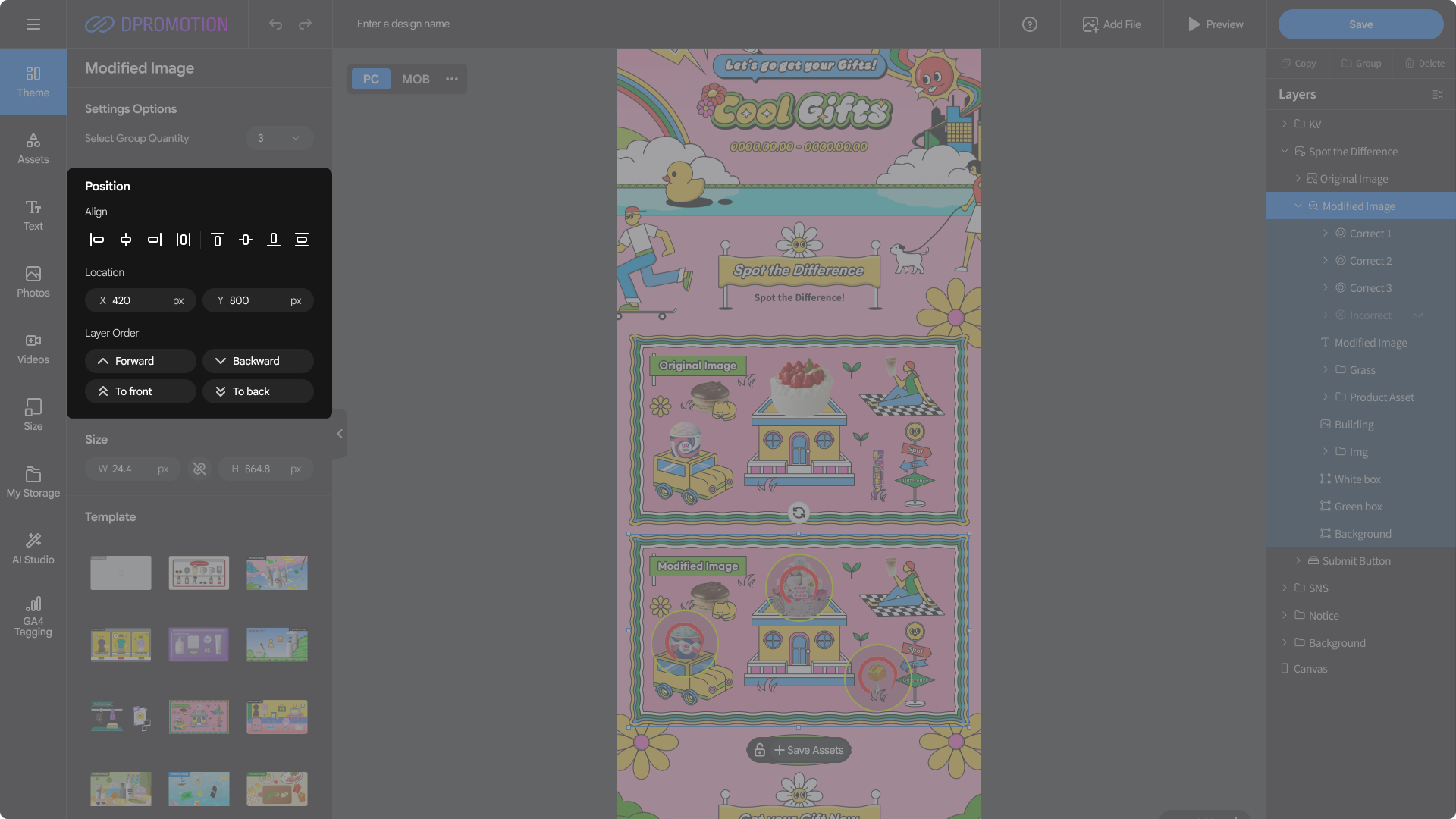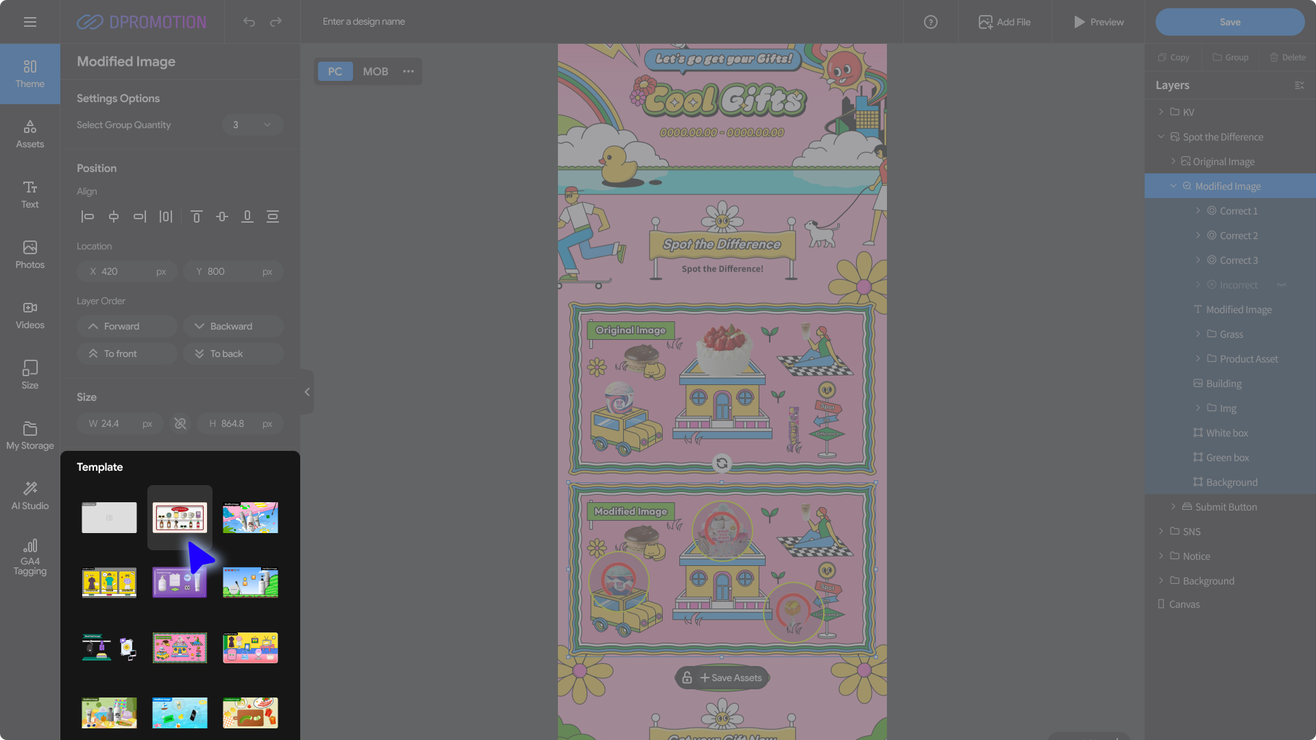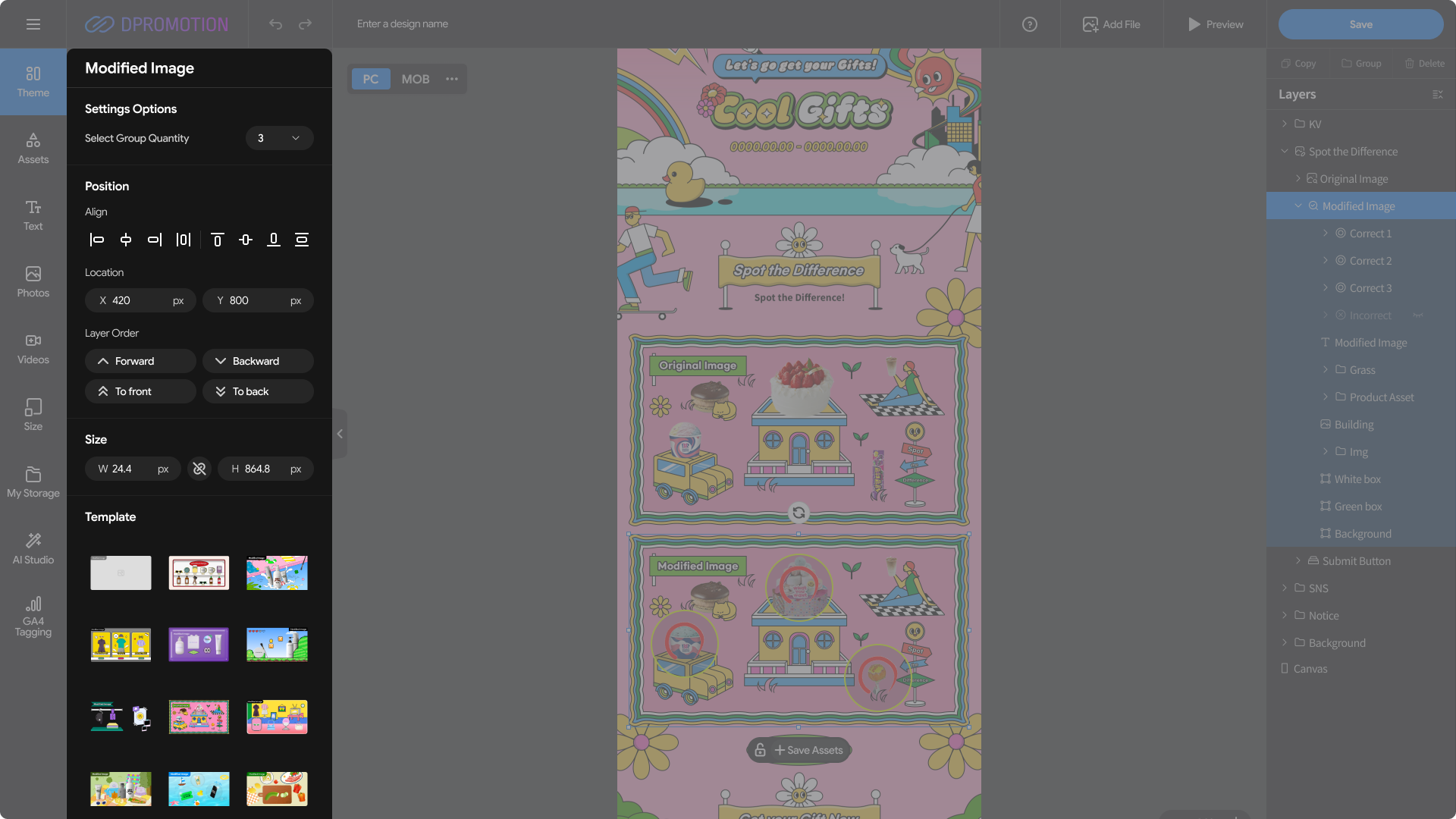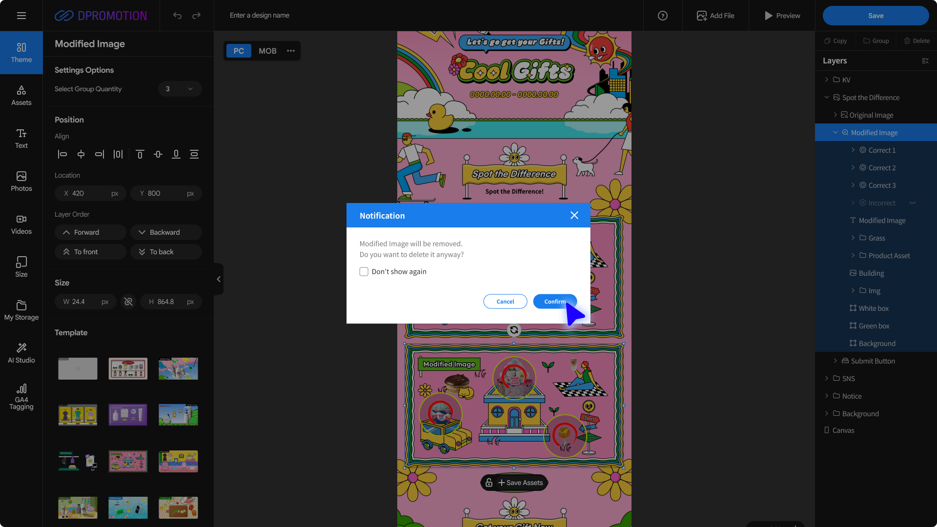 Double-click the Modified Image template area in the Spot the Difference section of the design editor with your mouse, or select Spot the Difference > Modified Image in the right Layers panel to open the Modified Image settings panel in the left settings panel.