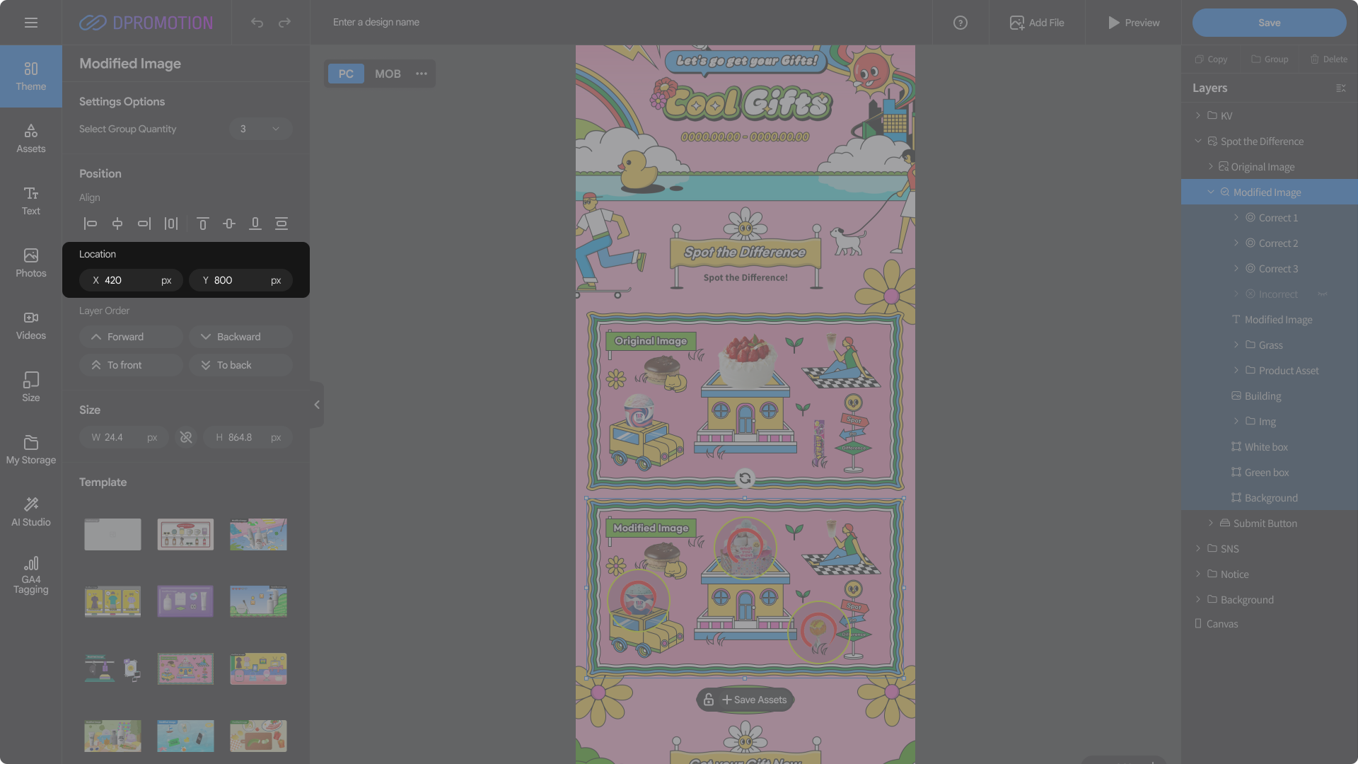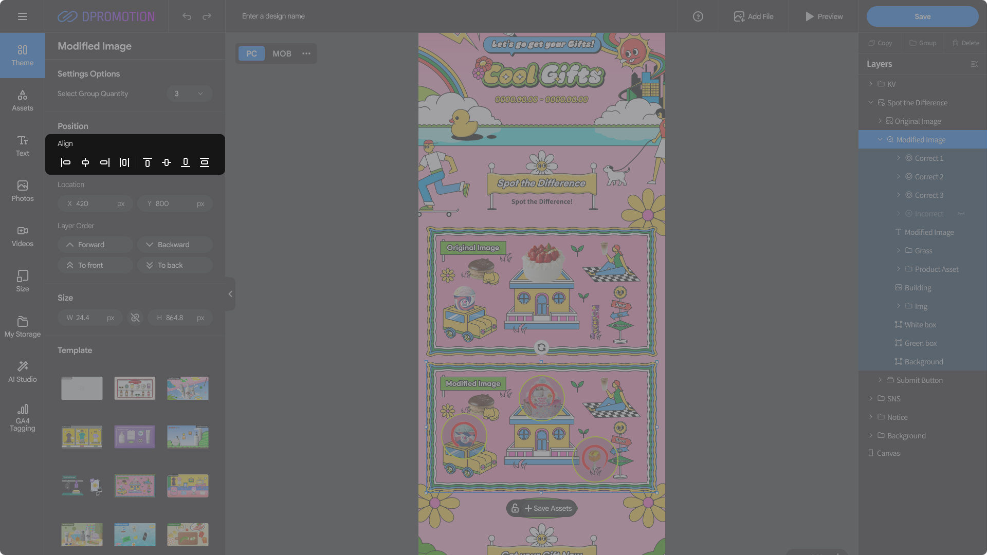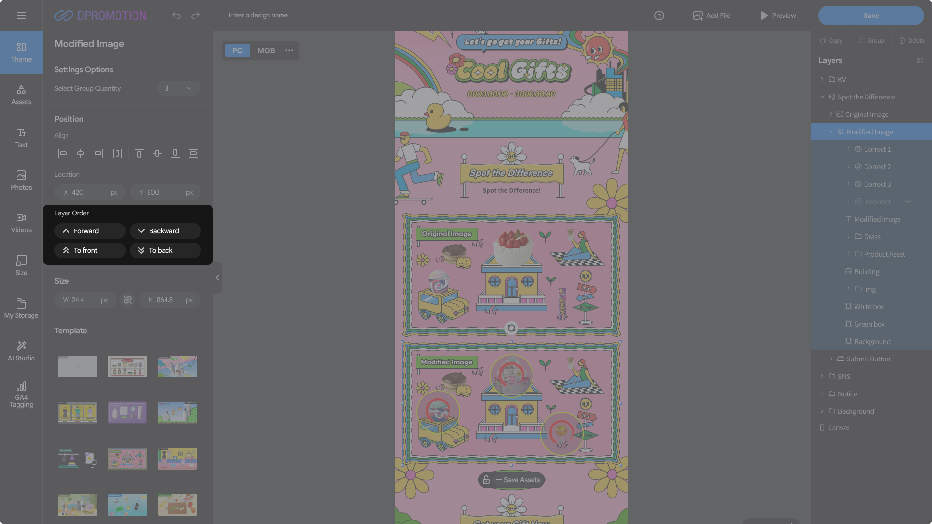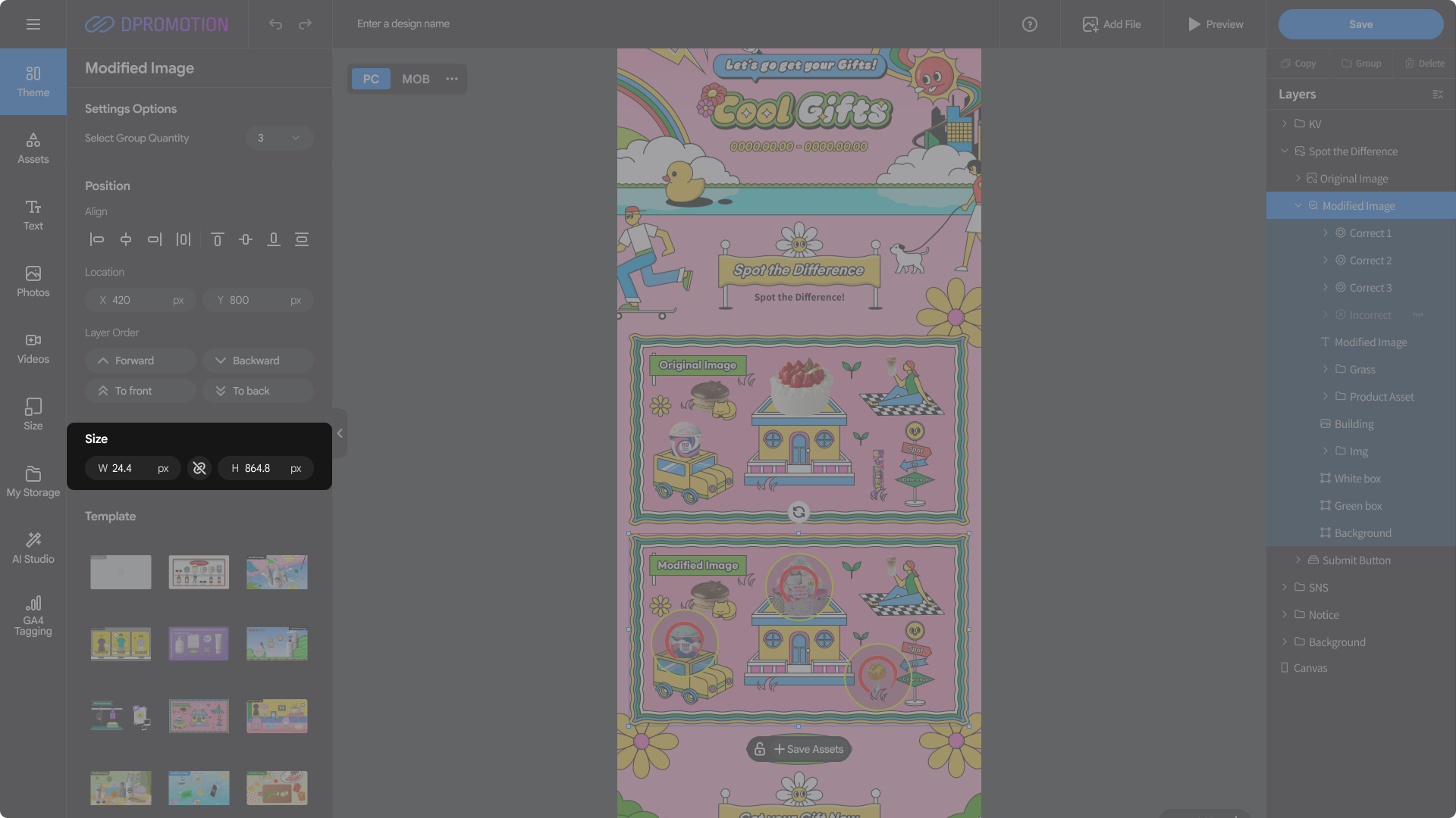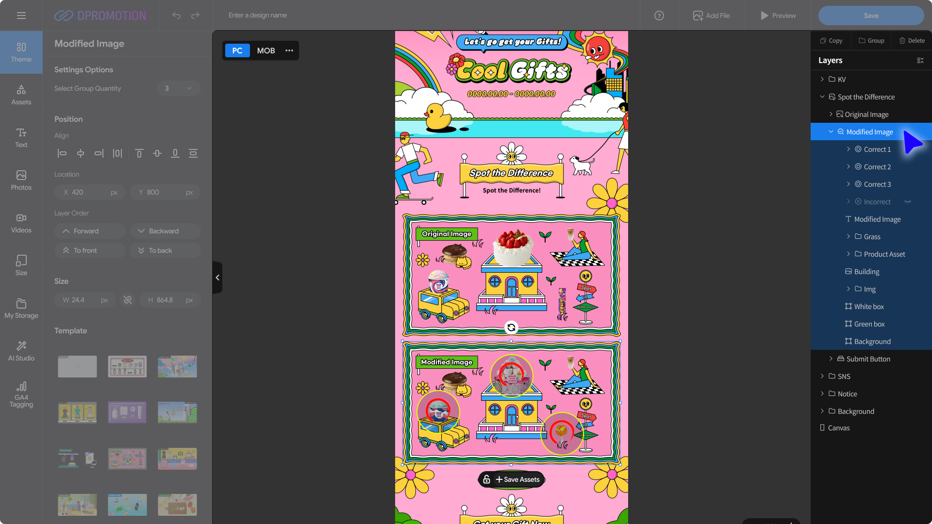 Double-click the Modified Image template area in the Spot the Difference section of the design editor with your mouse, or select Spot the Difference > Modified Image in the right Layers panel to open the Modified Image settings panel in the left settings panel.