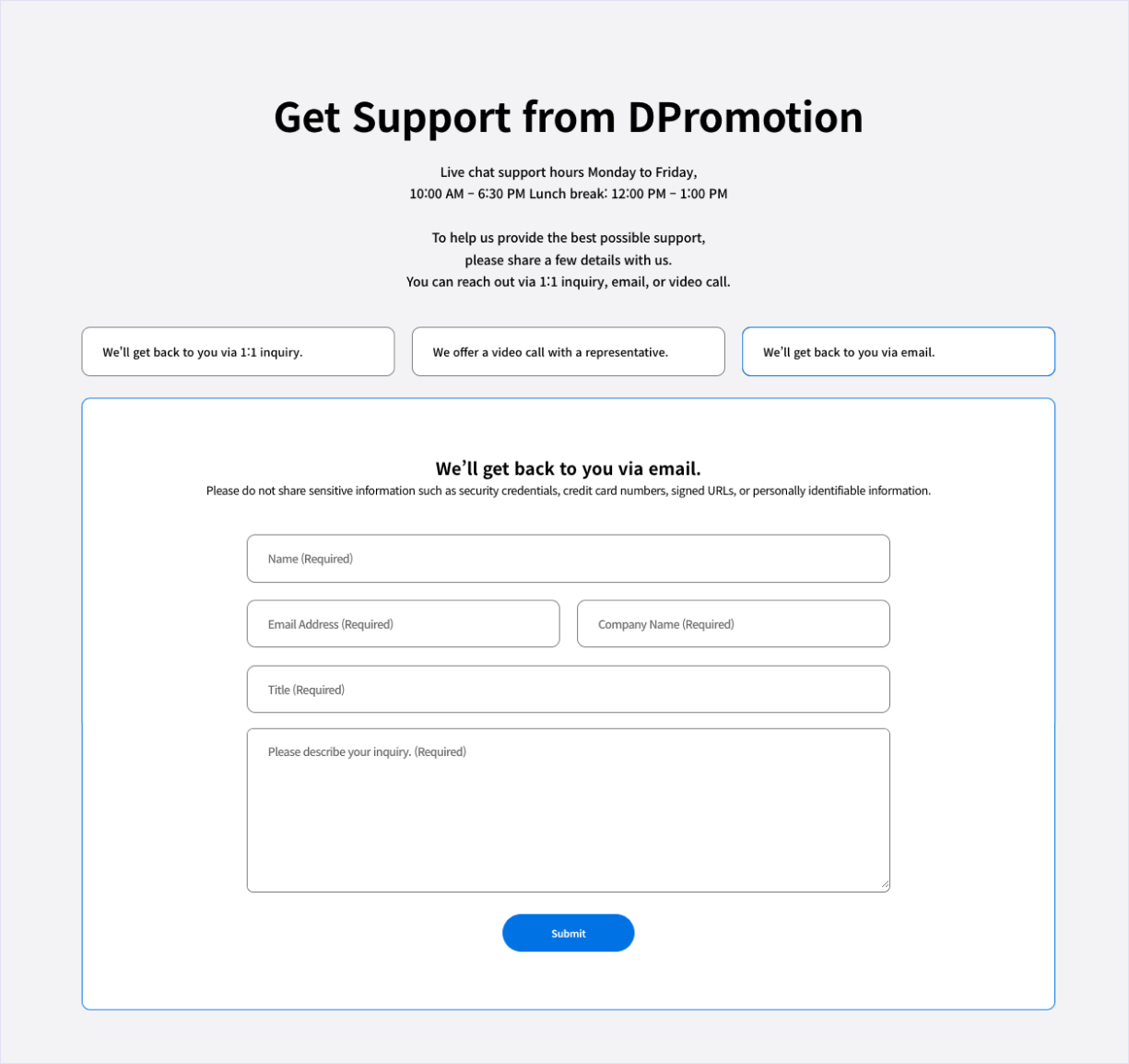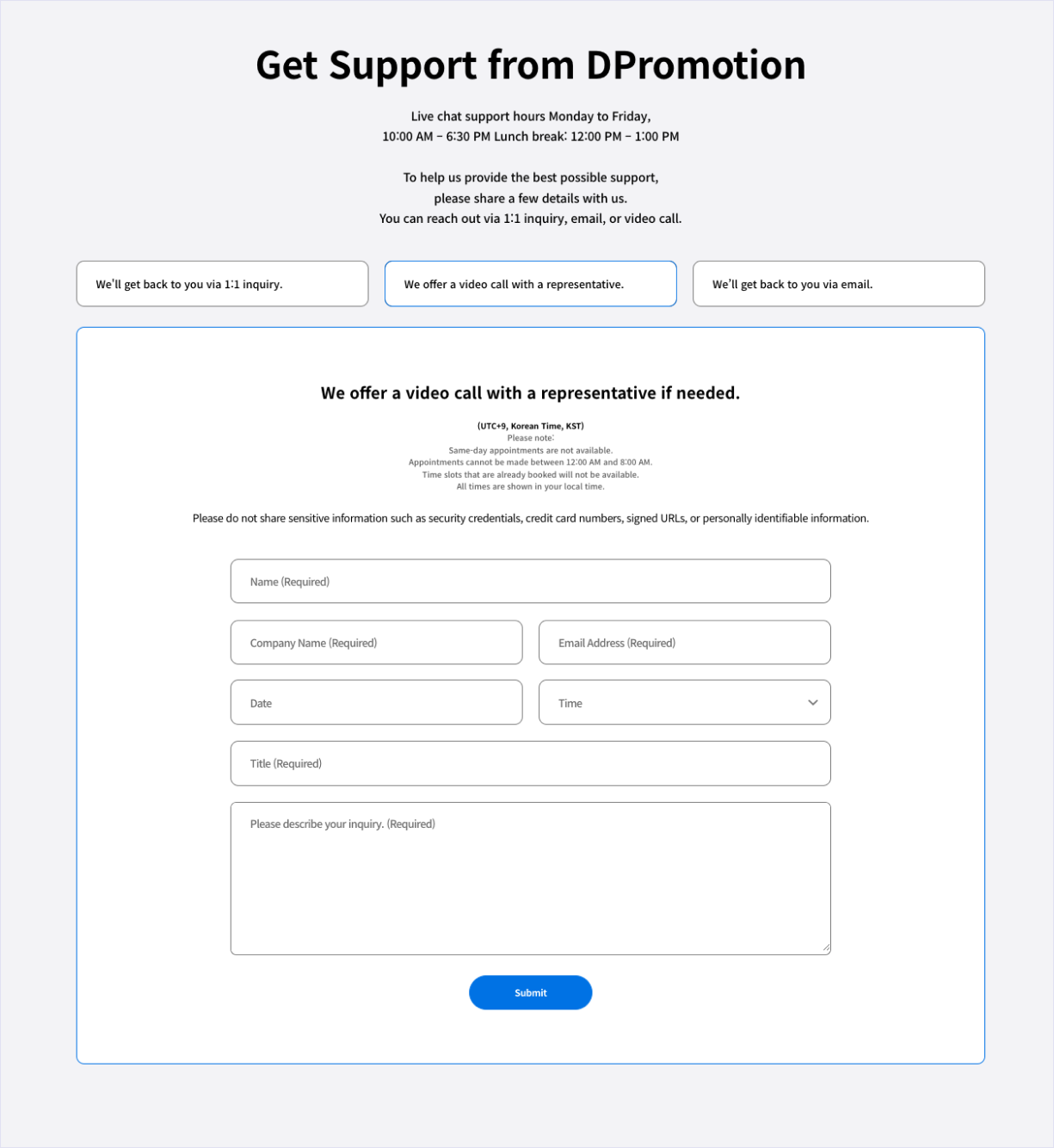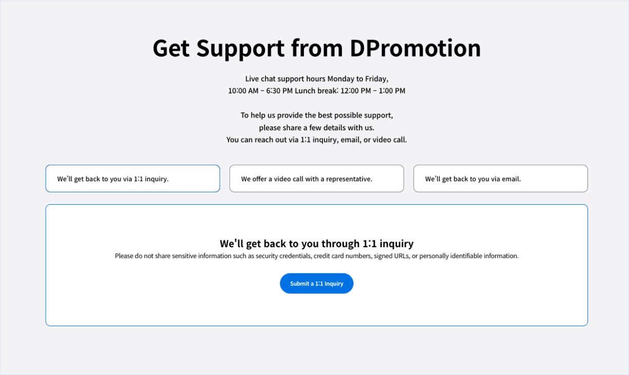Have questions? Reach out via 1:1 Inquiry, Video Call, or Email.