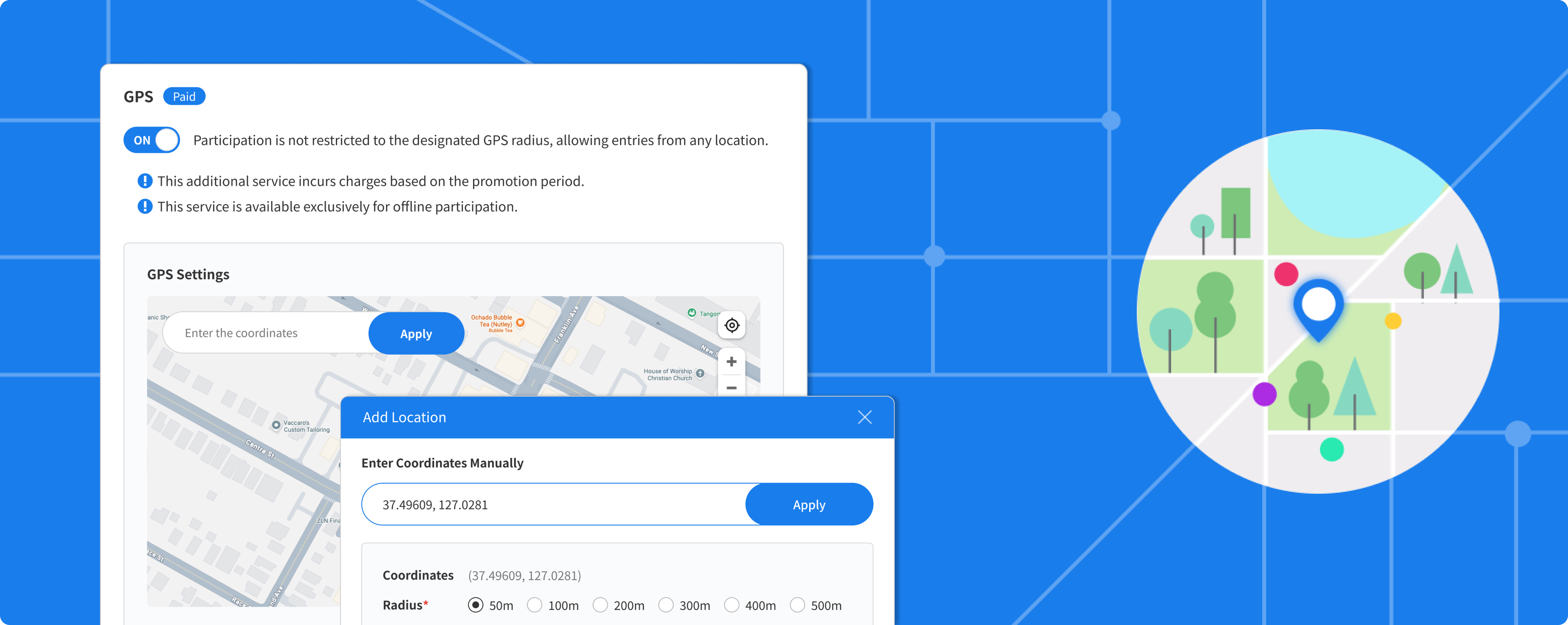 - Flexible radius settings for different venue types: From small indoor store spaces to large-scale festivals and event venues, you can adjust the participation radius based on the registered coordinates to build flexible promotions tailored to your operational purpose.