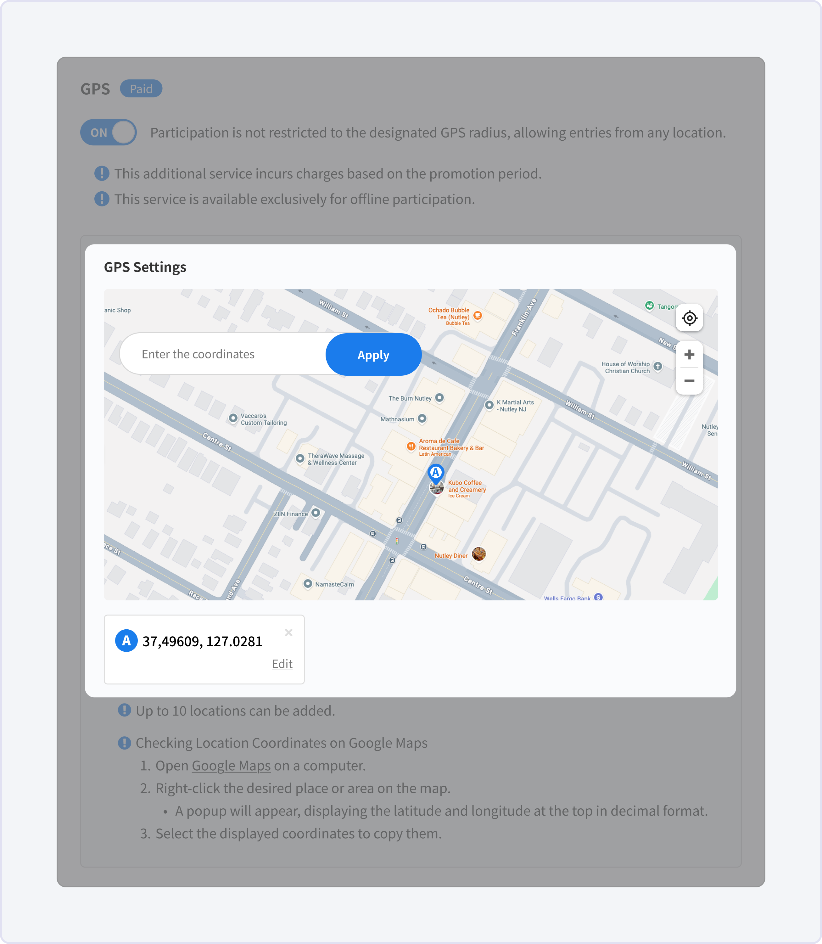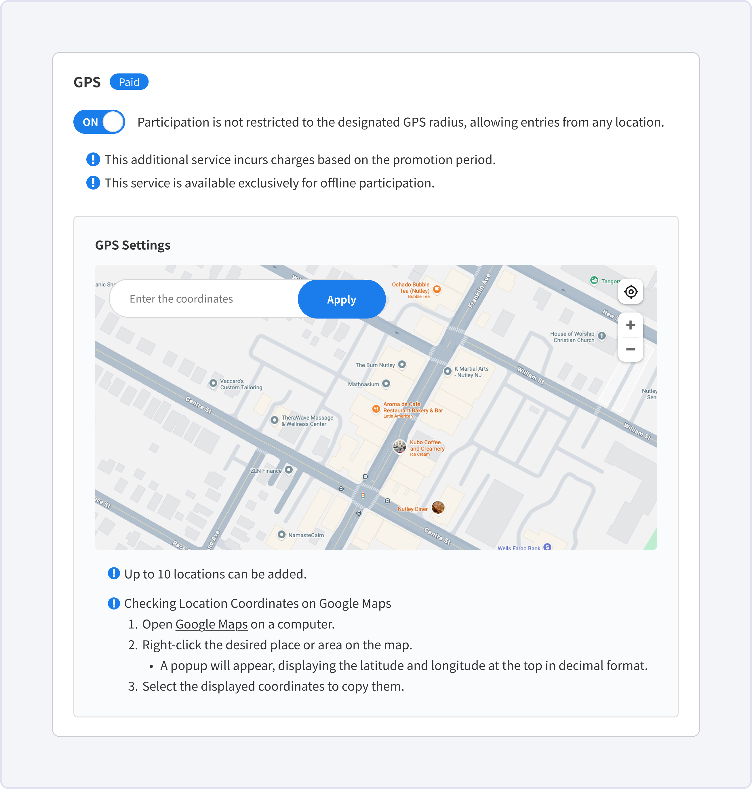 - Optimized for multi-branch brands: Up to 10 GPS coordinates can be registered, allowing multiple locations nationwide to be managed under a single promotion flow without separate setups. This ensures consistent customer experiences for brands operating many locations.