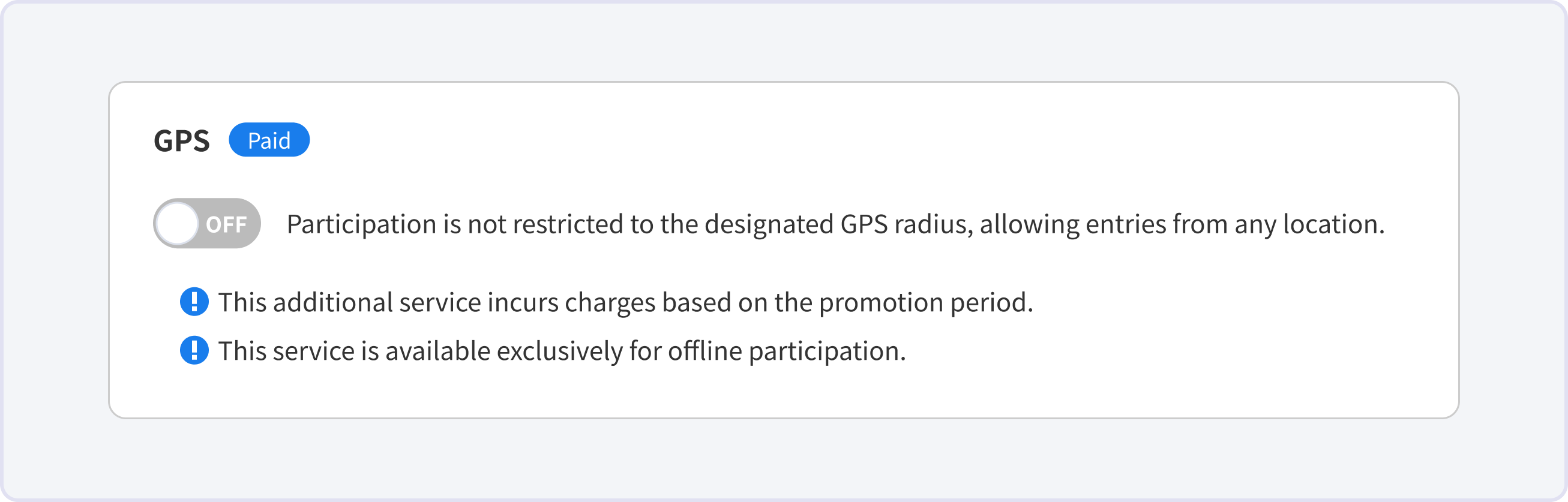 The GPS setting feature restricts promotion participation based on the participant’s actual location.