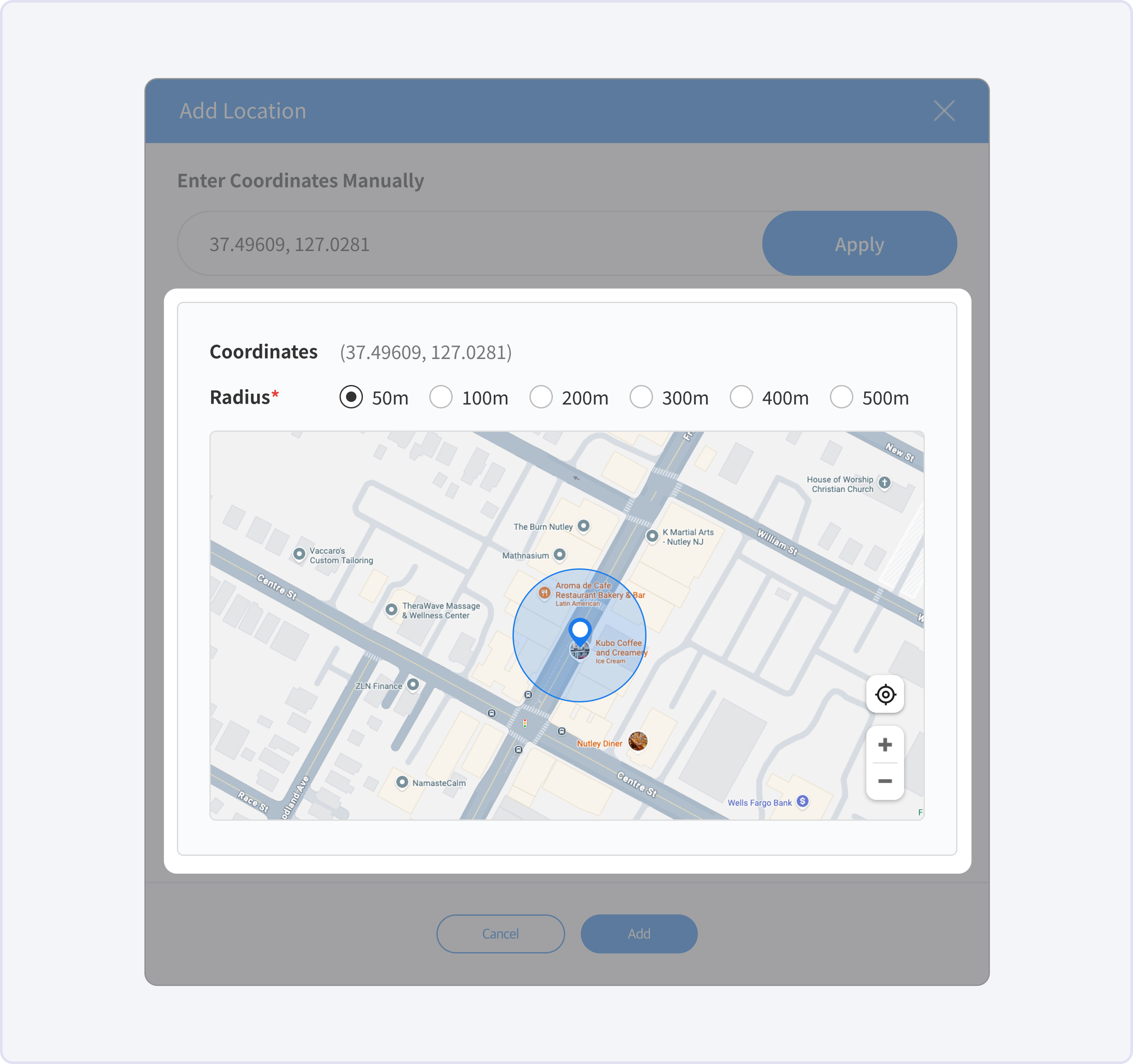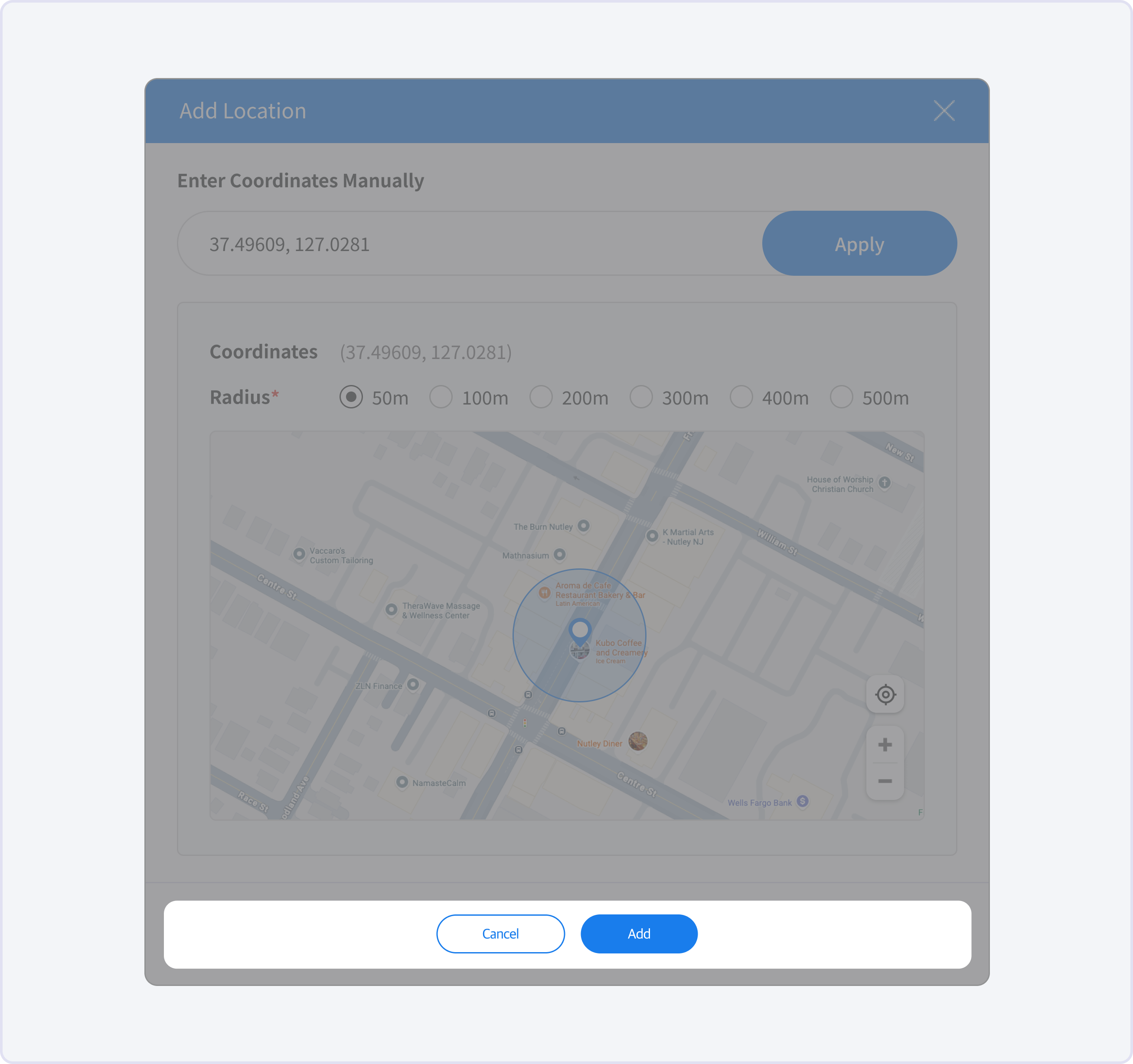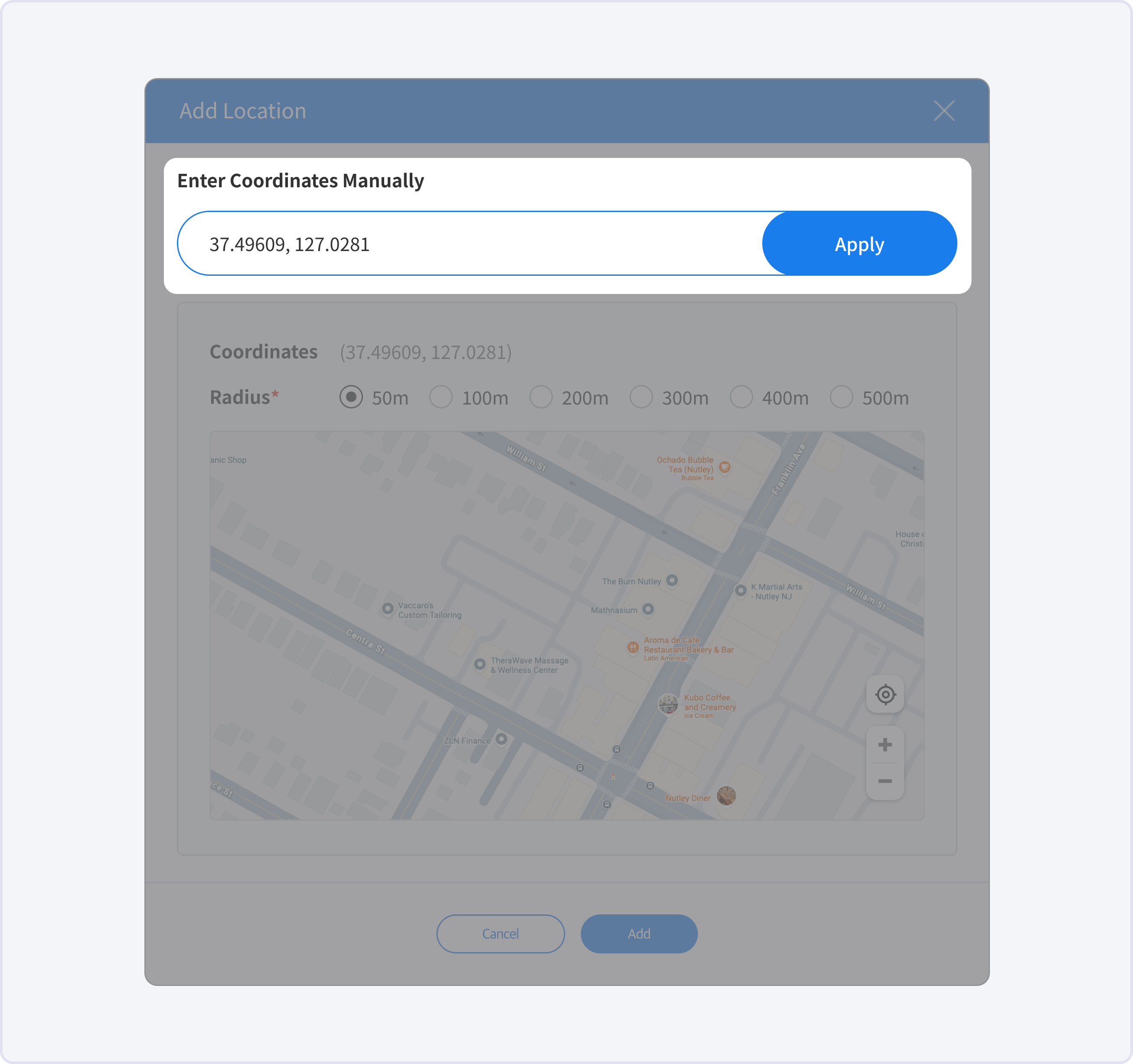 - Paste the copied latitude/longitude into the coordinate input field in the Add Location popup.