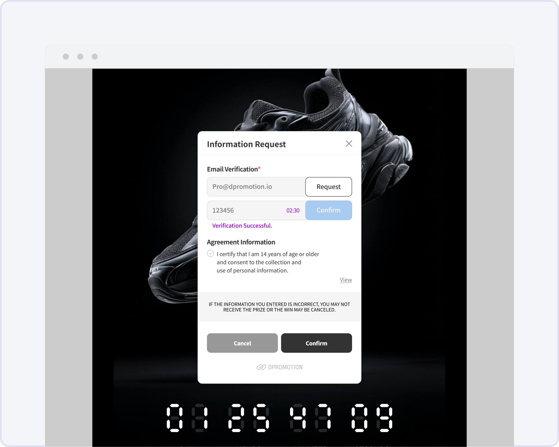 The Email Verification feature verifies participant identity by sending a verification code to the email address entered during the promotion process.