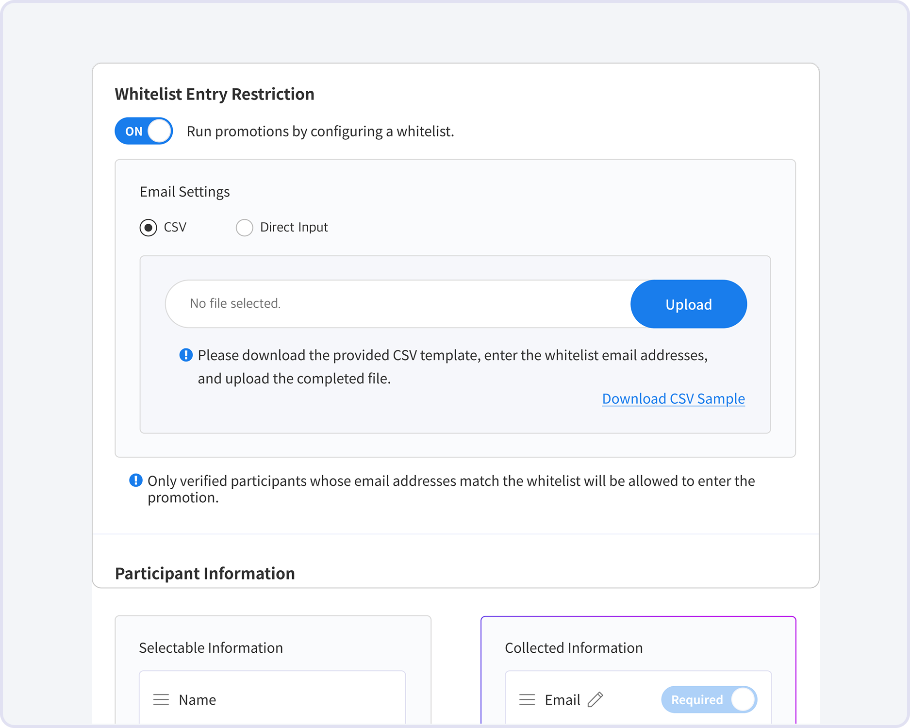 Entry Condition Setting > Whitelist Entry Restriction is ON, only participants whose email addresses are registered on the whitelist can enter the promotion.