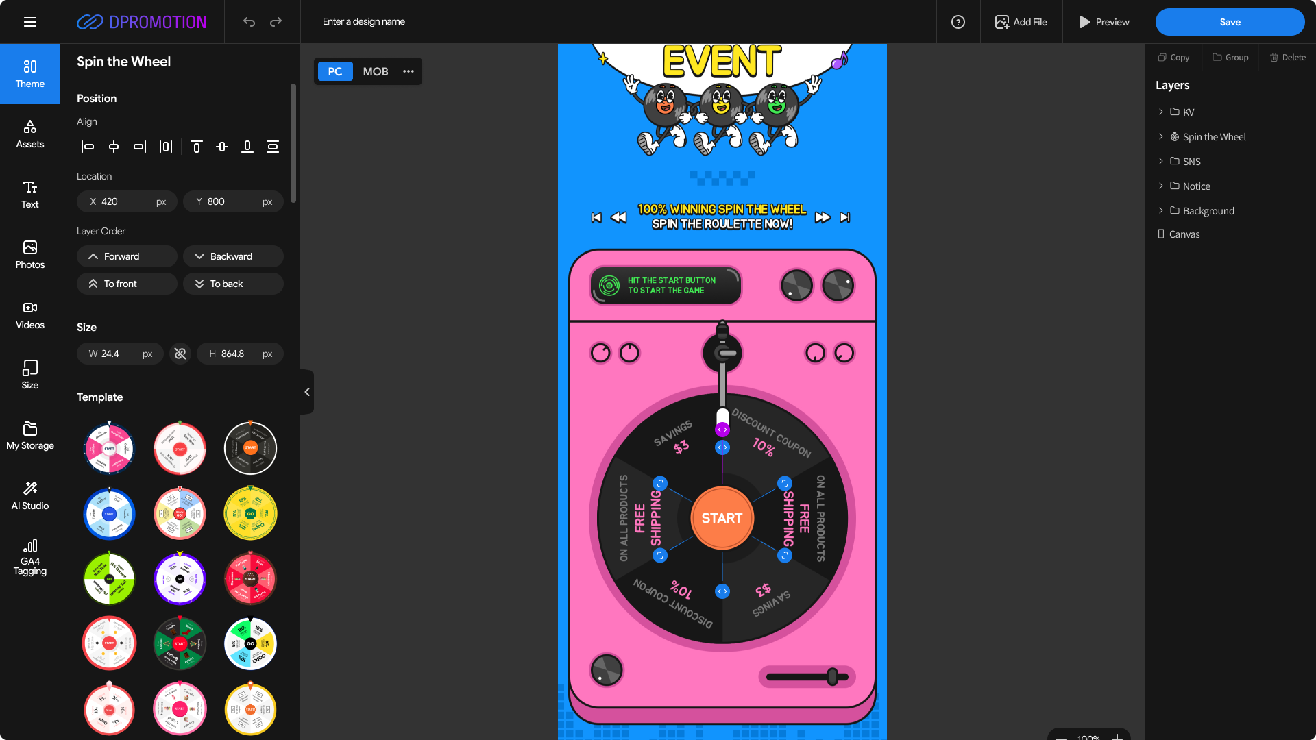 The editor provides a dedicated editing mode for Spin the Wheel events, allowing you to easily modify wheel components and objects,