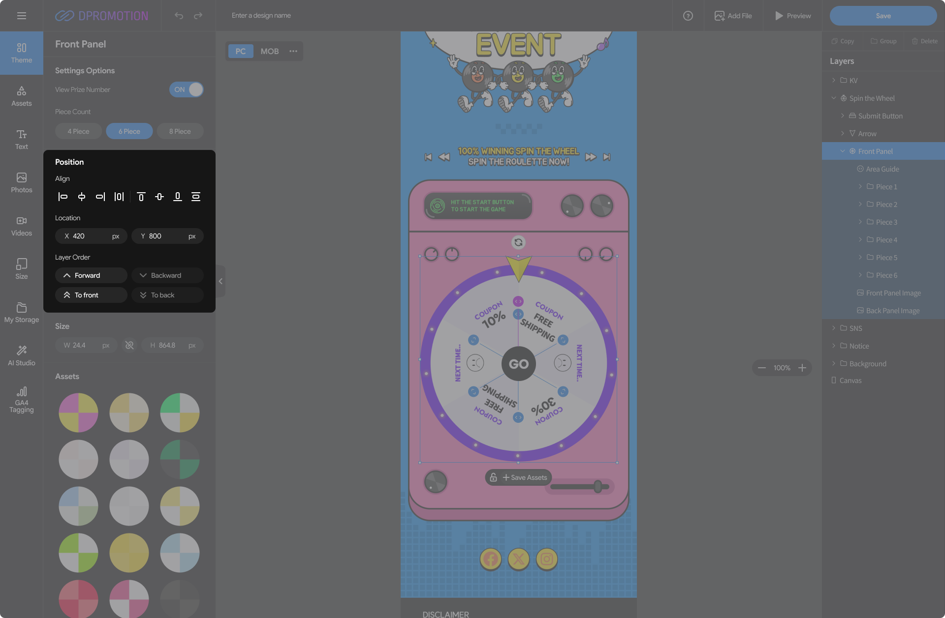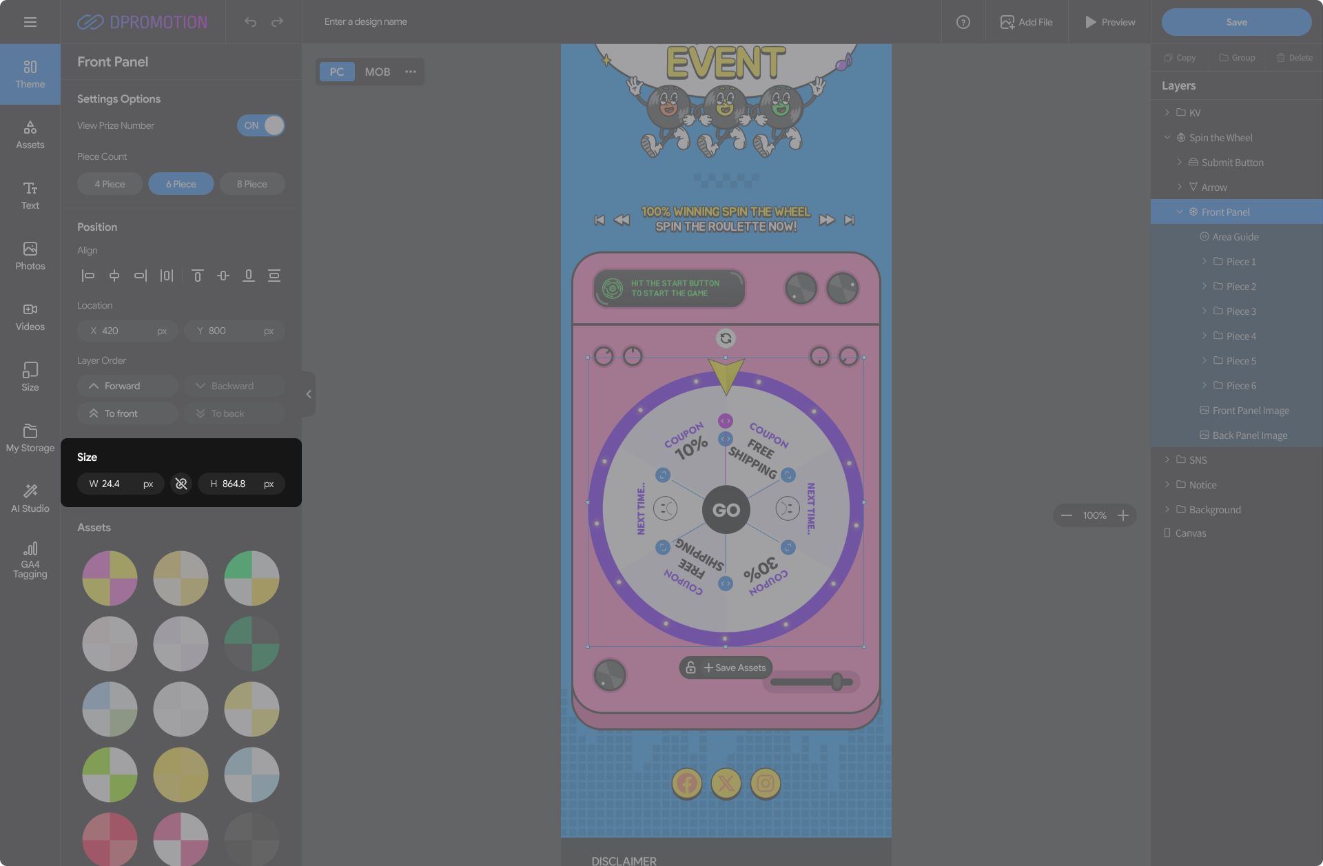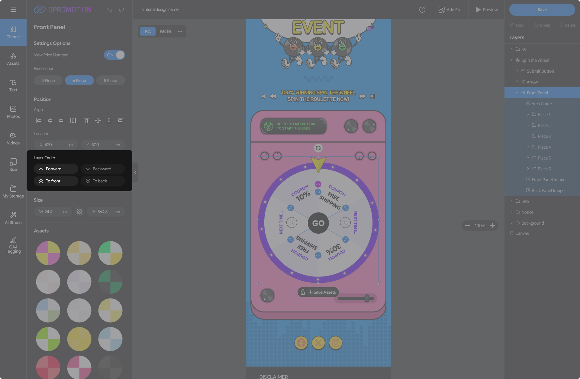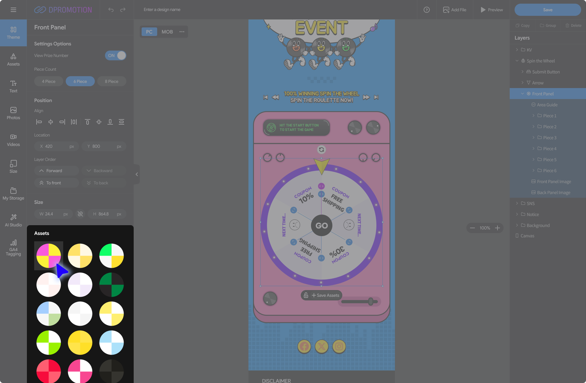 Double-click the Front Panel Asset in the Spin the Wheel with your mouse in the design editor, or select the Front Panel layer in the right Layers panel to open the Front Panel settings panel in the left settings panel.