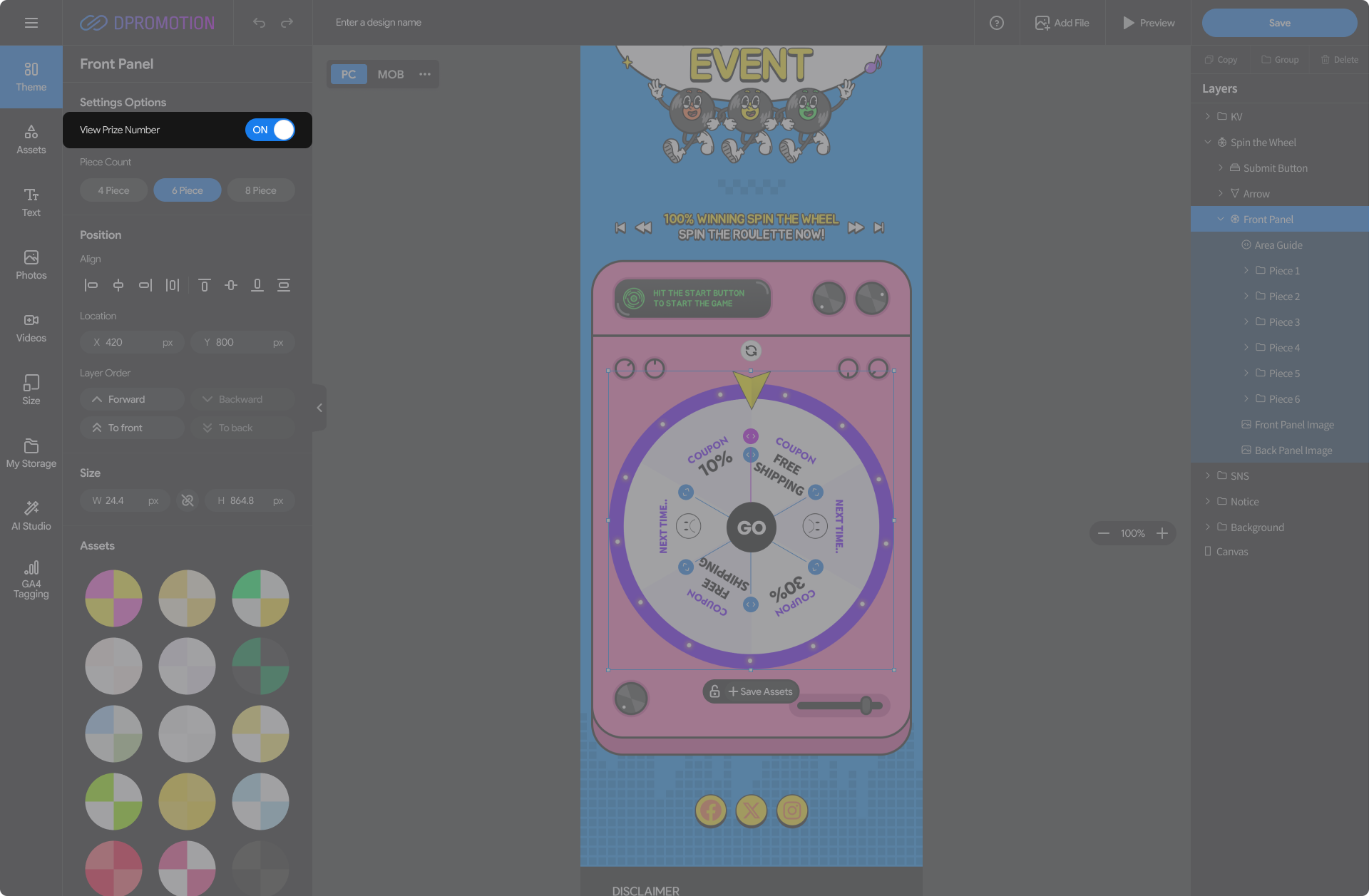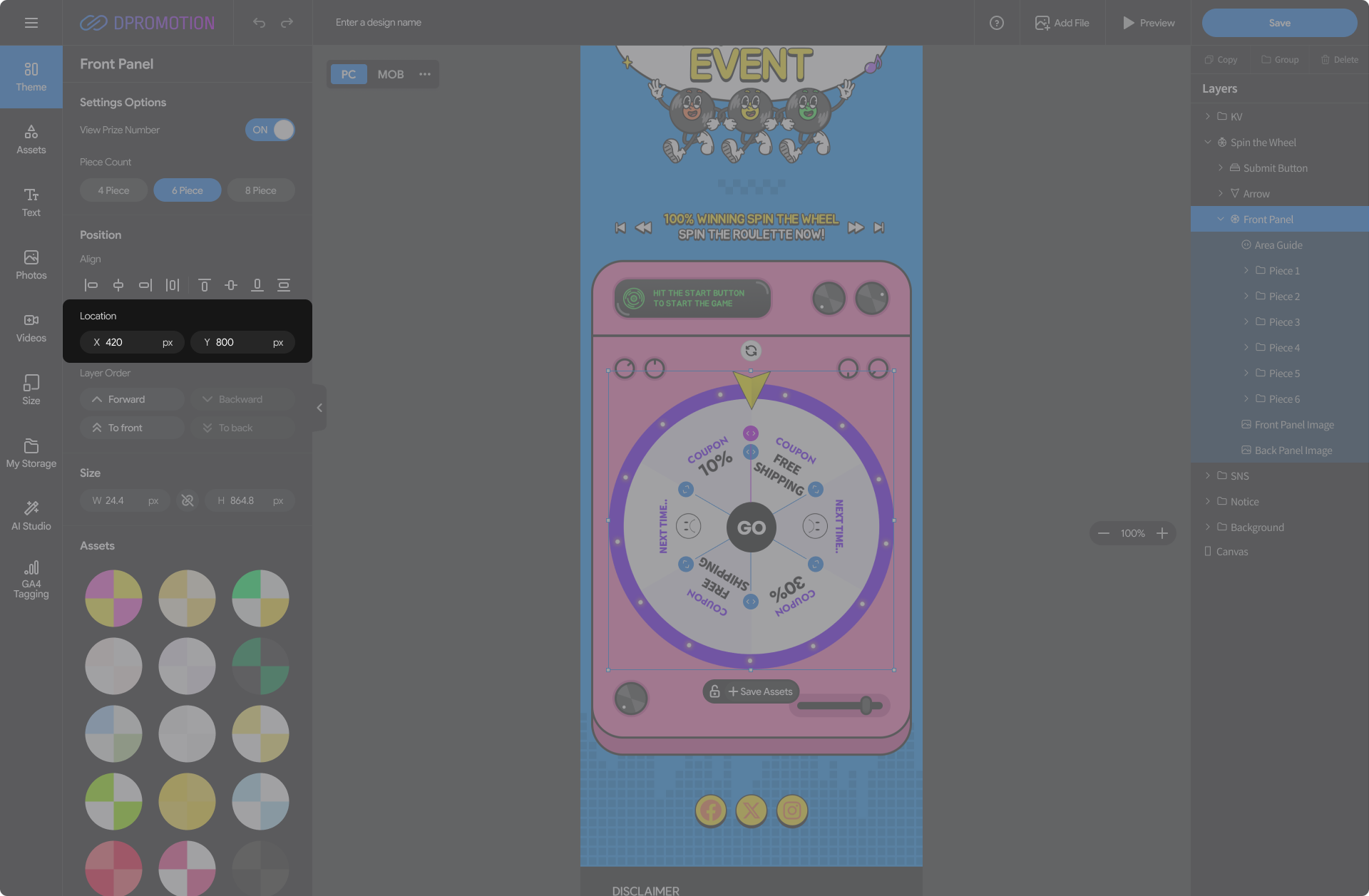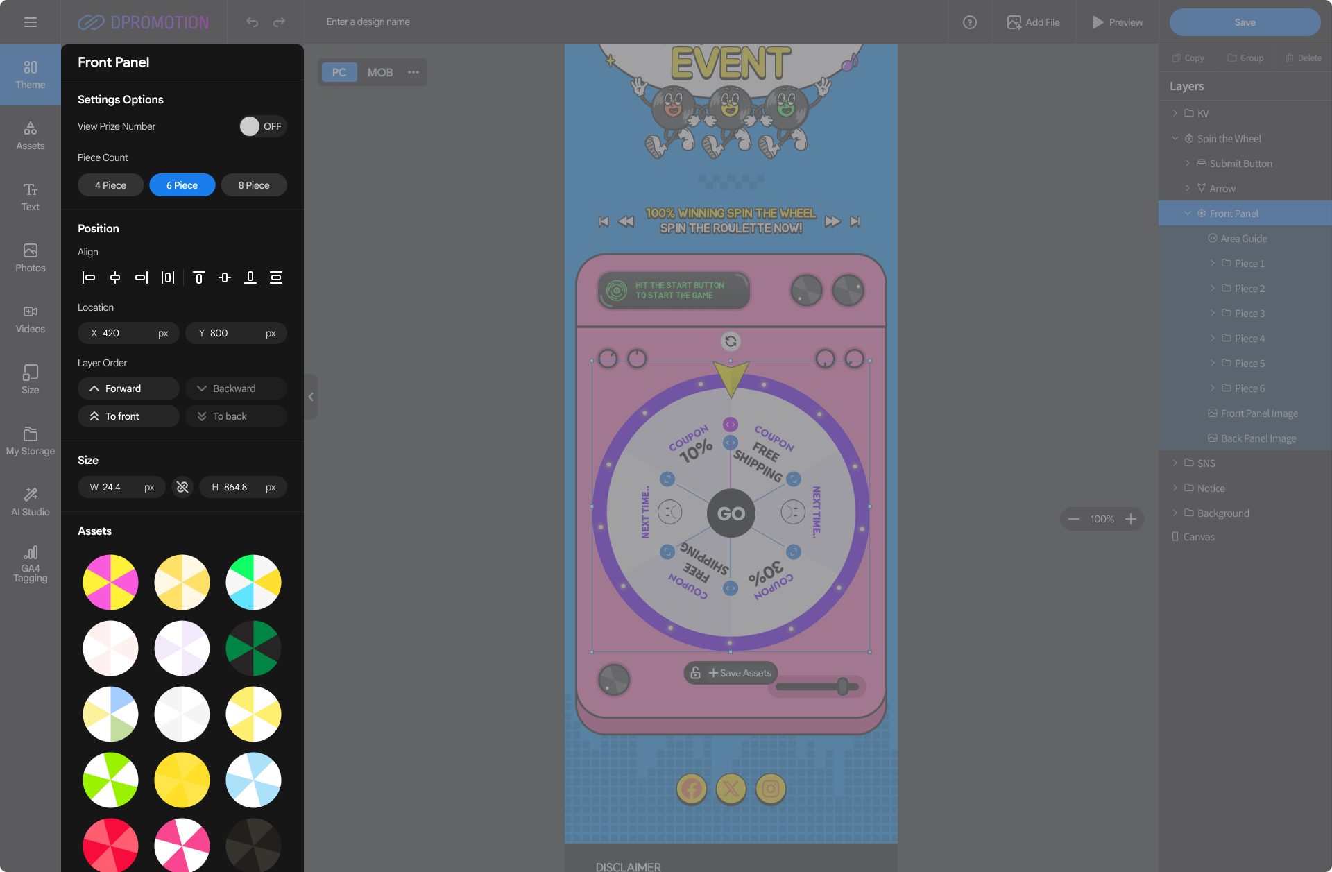 Double-click the Front Panel Asset in the Spin the Wheel with your mouse in the design editor, or select the Front Panel layer in the right Layers panel to open the Front Panel settings panel in the left settings panel.