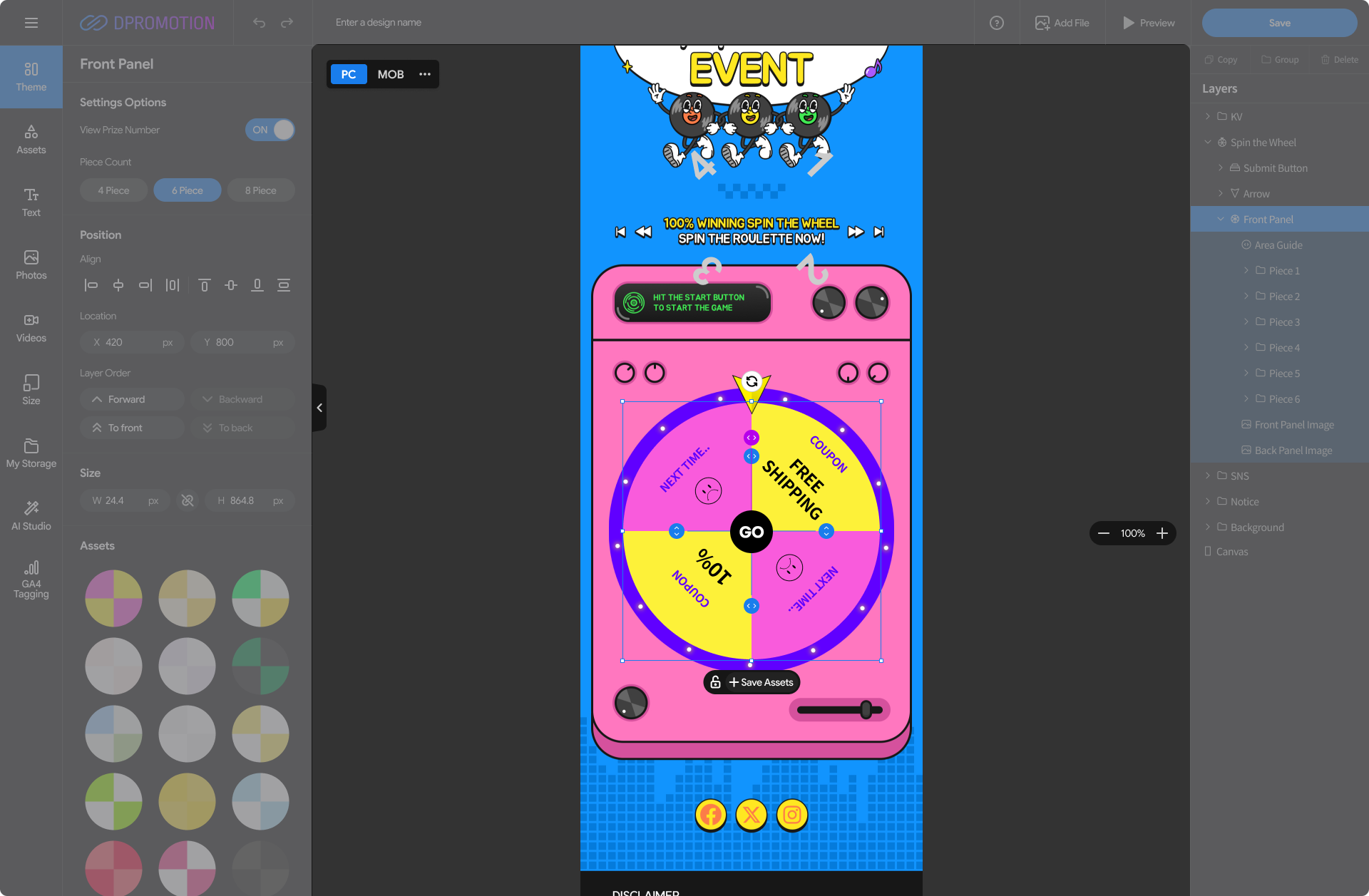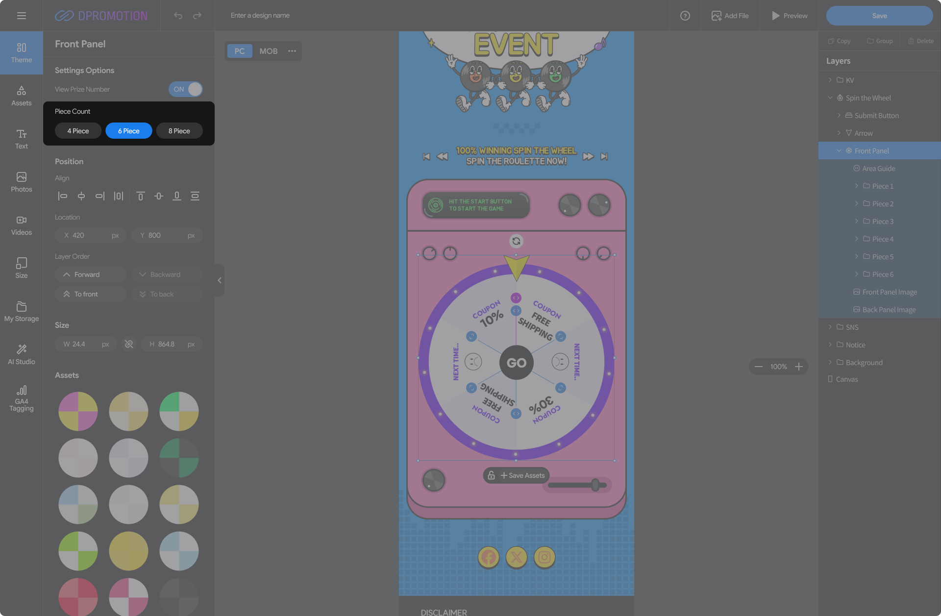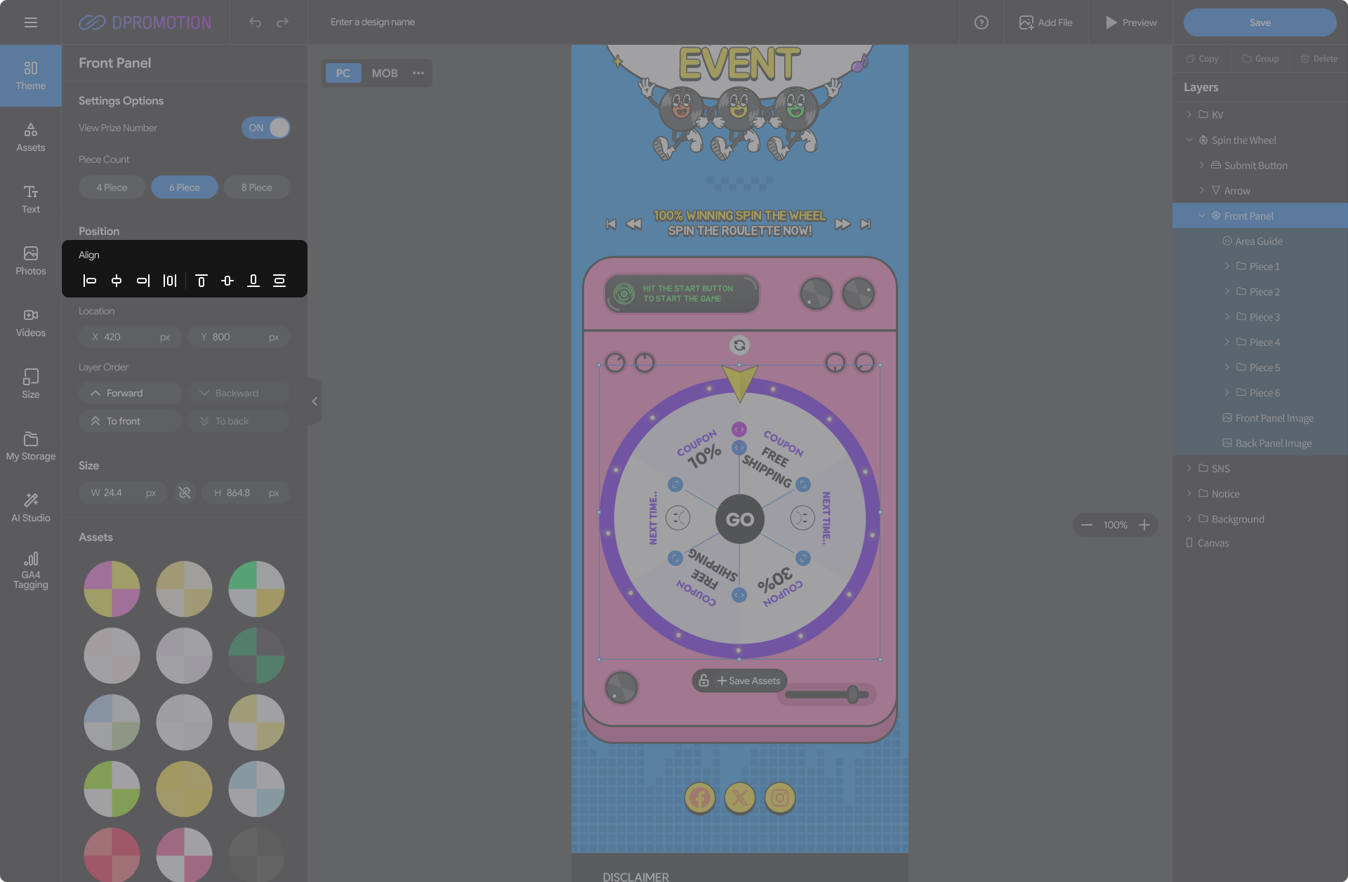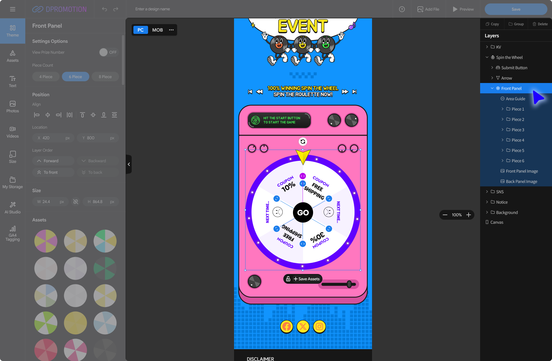 Double-click the Front Panel Asset in the Spin the Wheel with your mouse in the design editor, or select the Front Panel layer in the right Layers panel to open the Front Panel settings panel in the left settings panel.