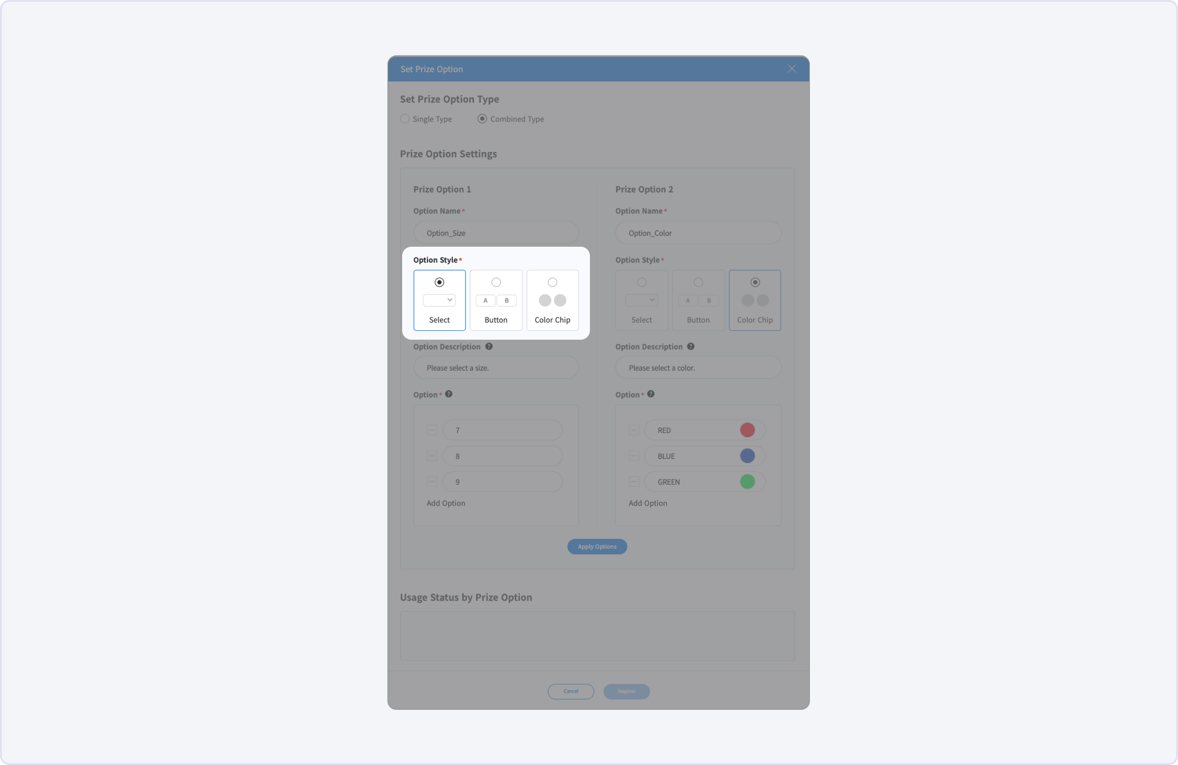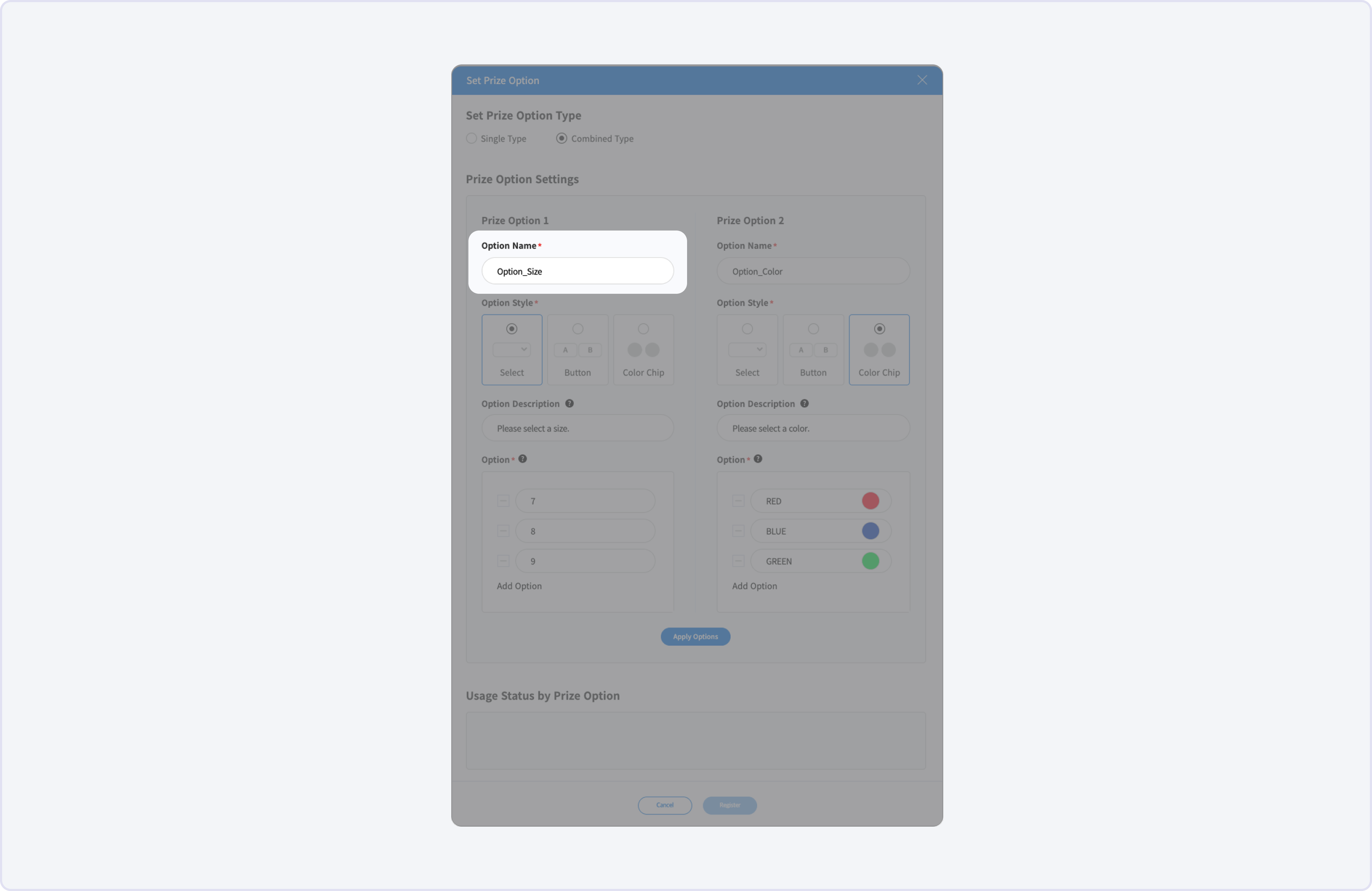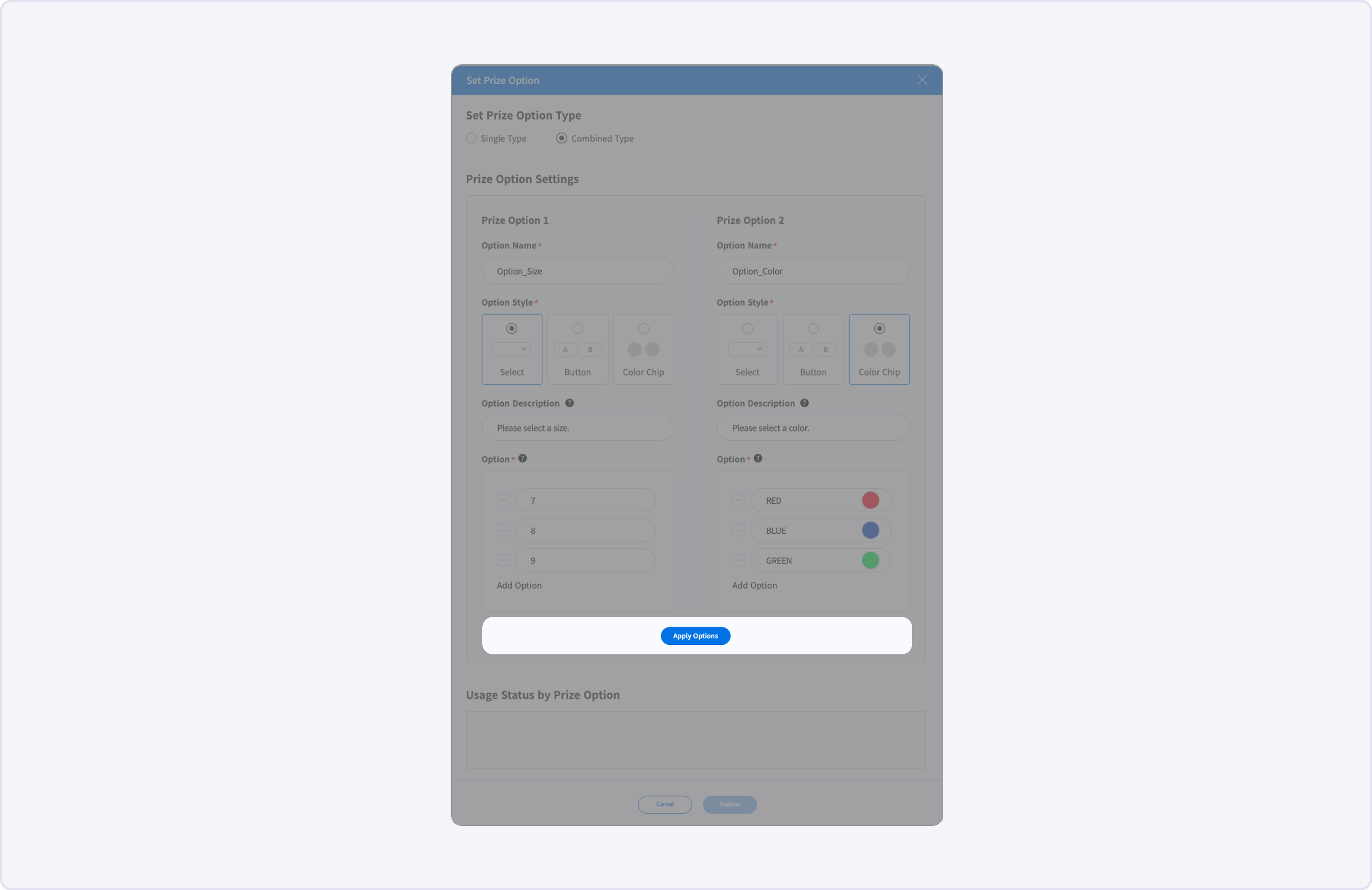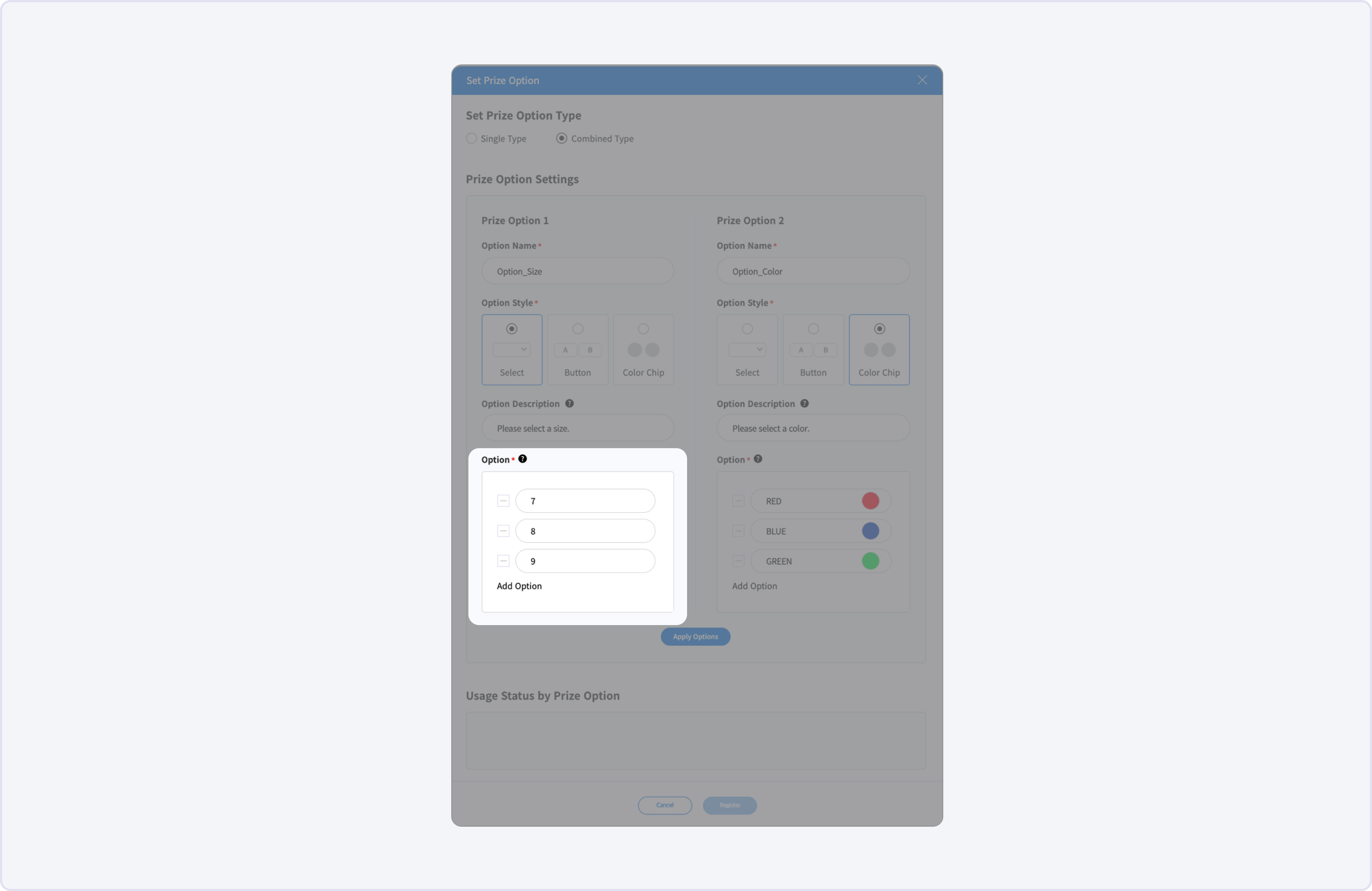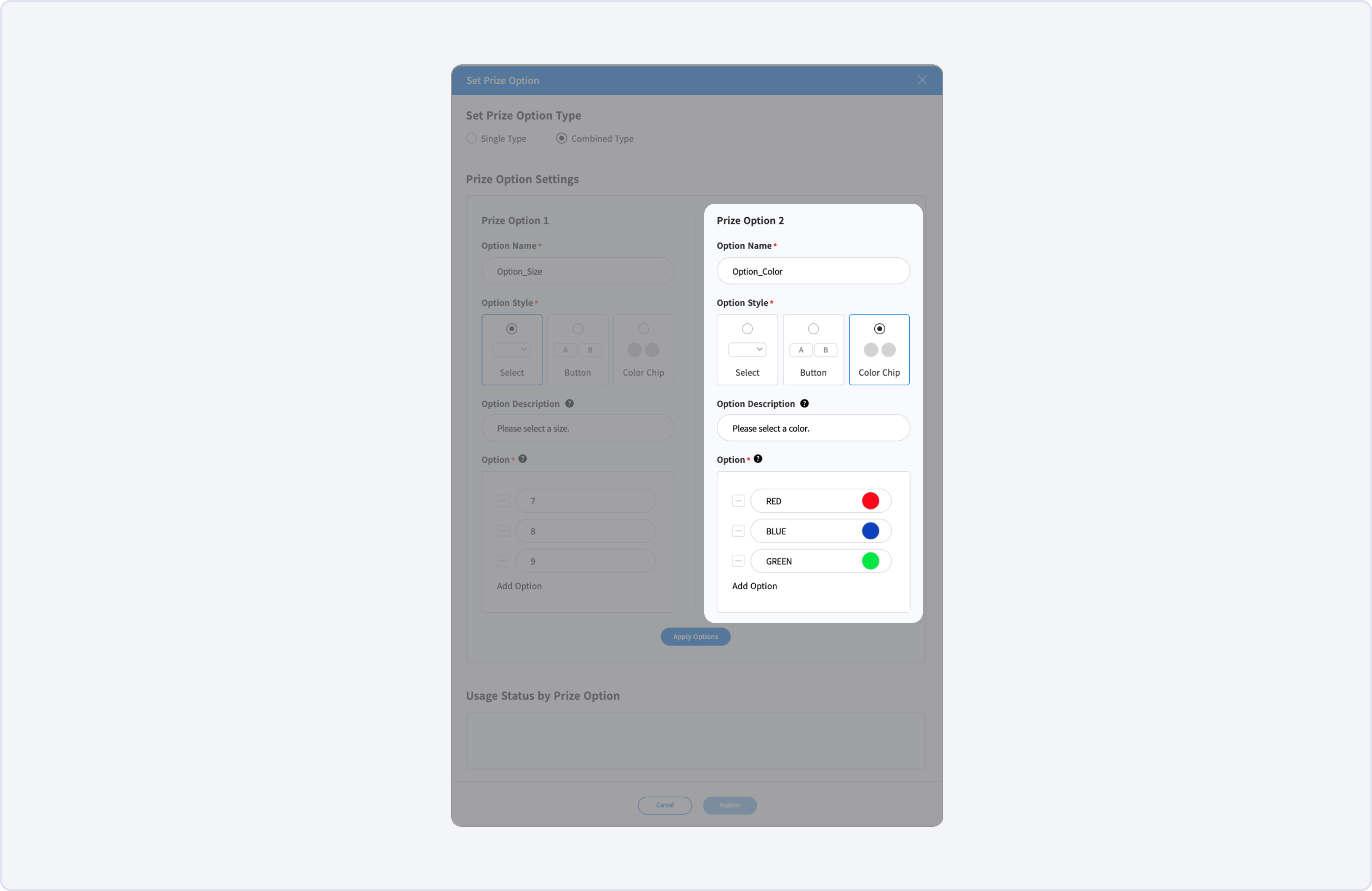In the prize option management screen, set the Prize Option Type (Single, Combination), Option Name, Option Style (Dropdown, Button, Color Chip), and Selection Items.