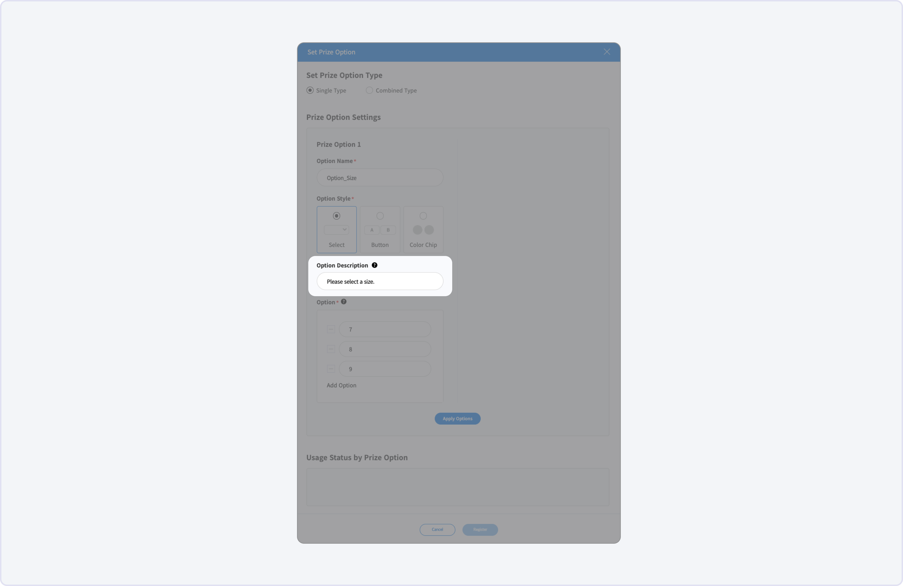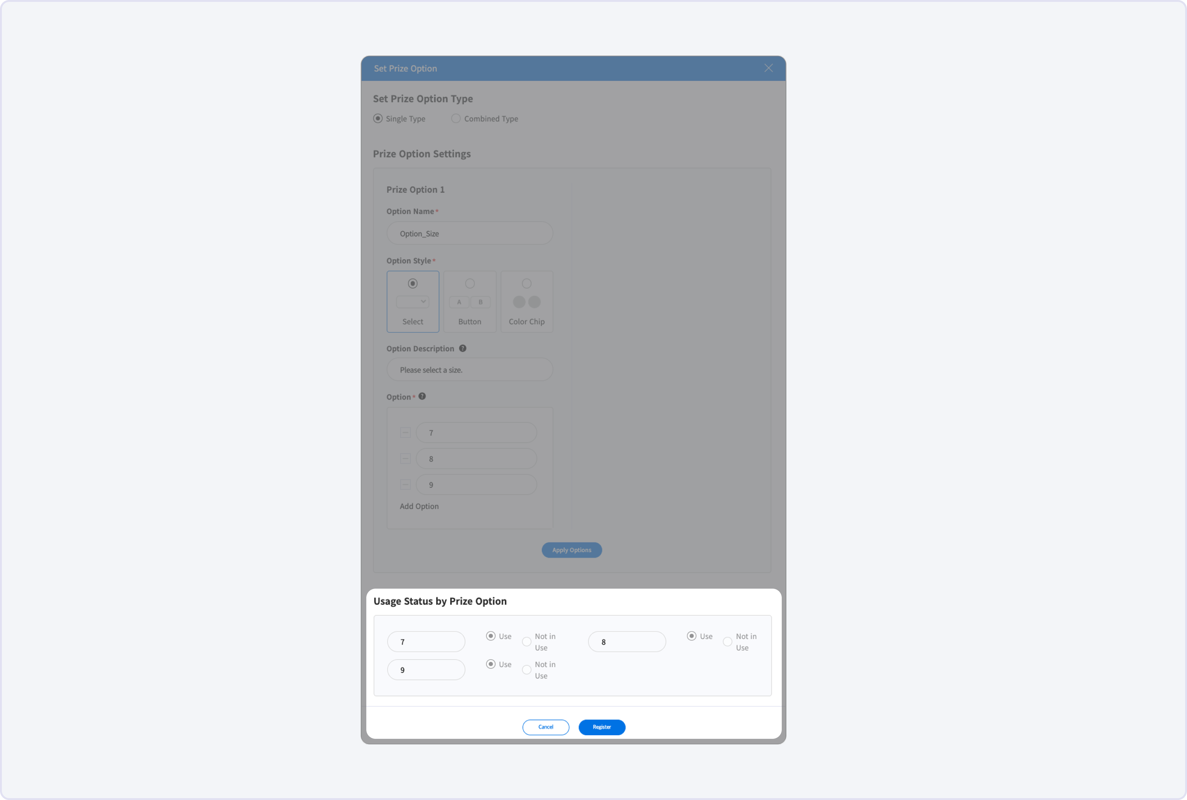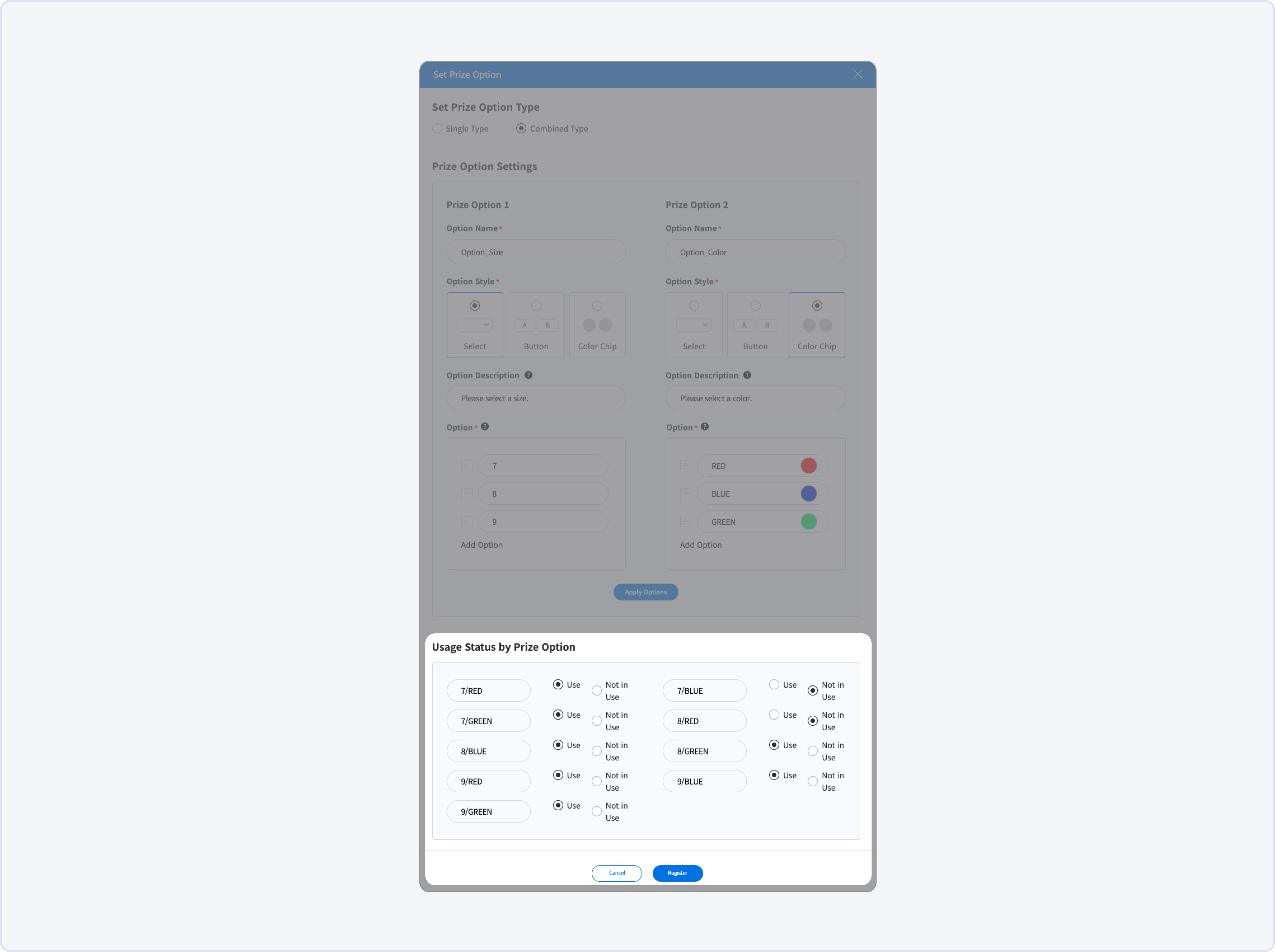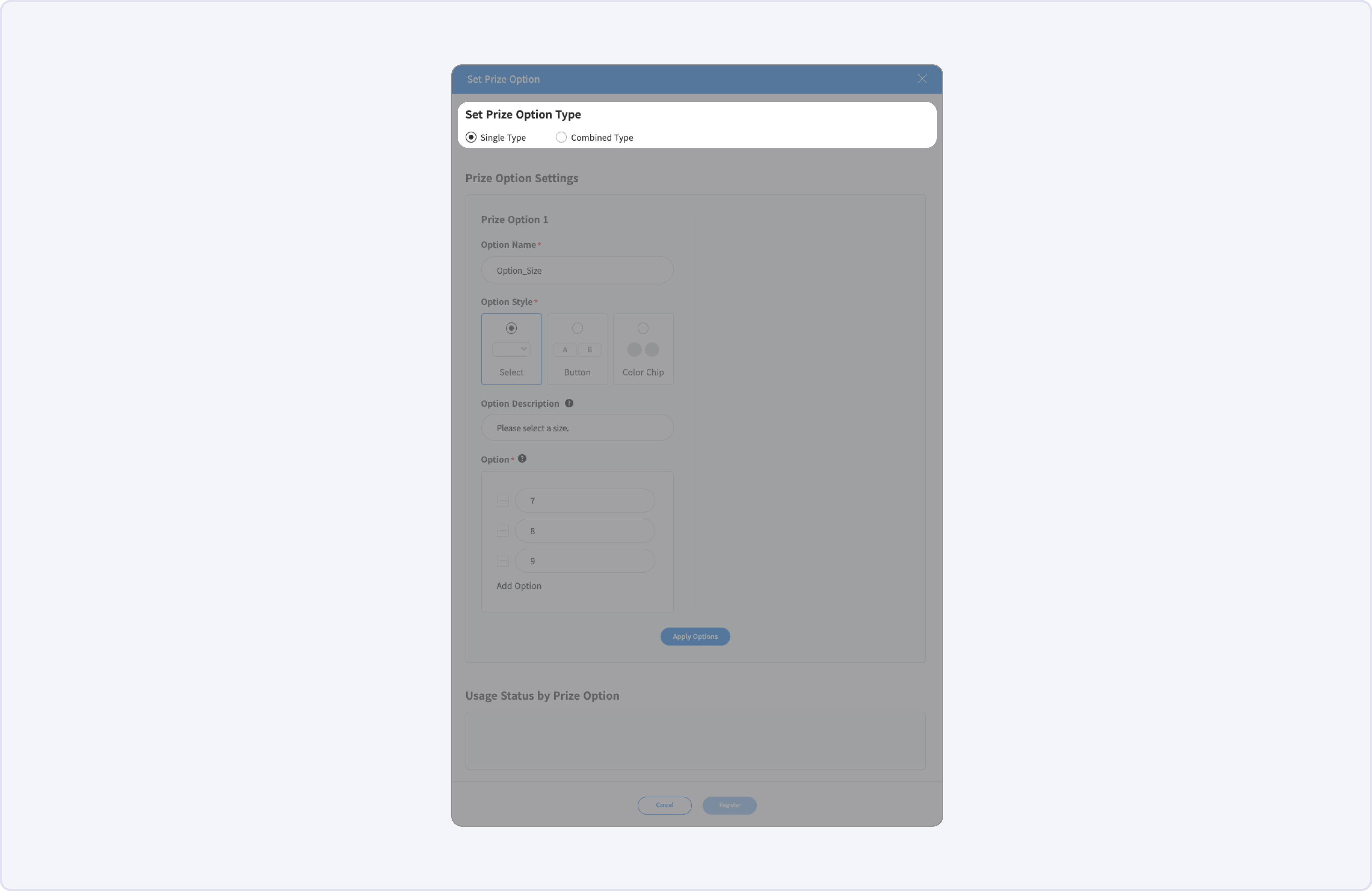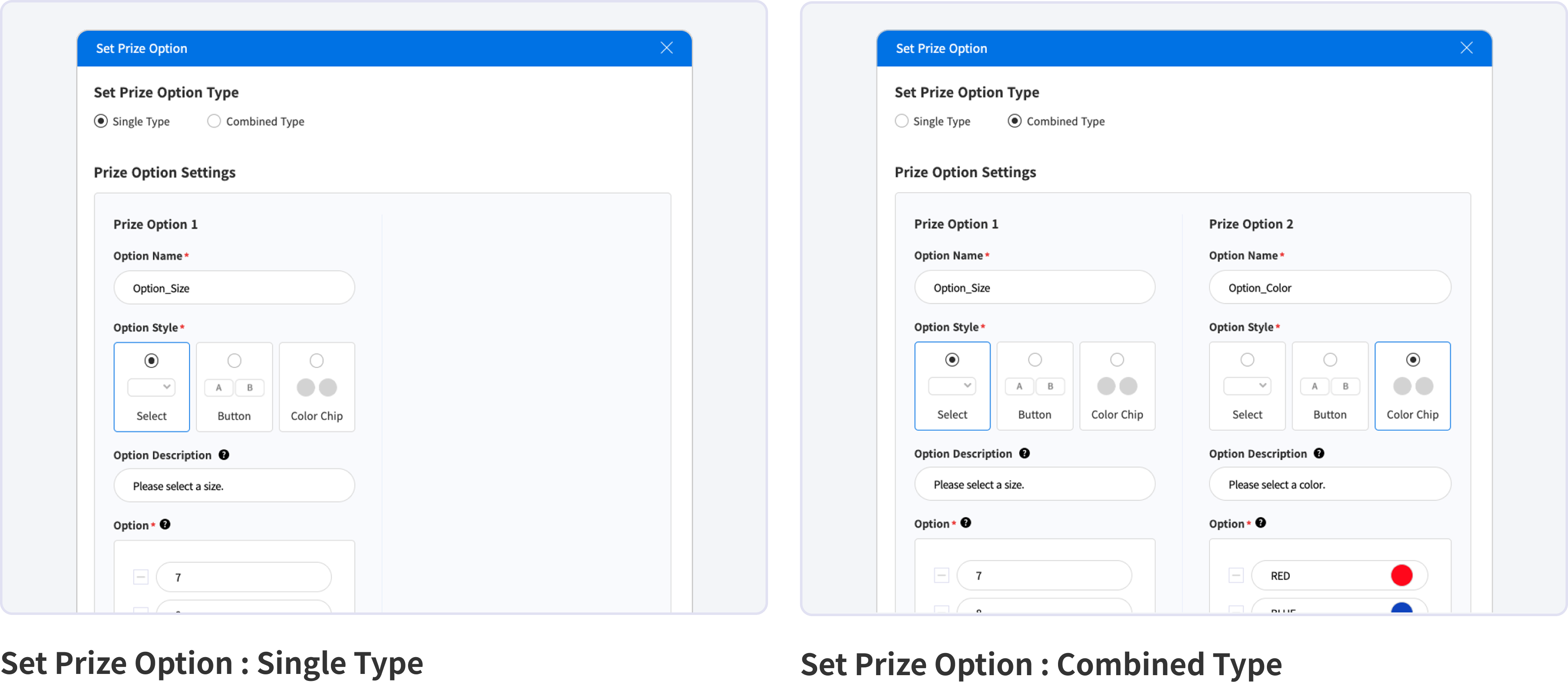 In the prize option management screen, set the Prize Option Type (Single, Combination), Option Name, Option Style (Dropdown, Button, Color Chip), and Selection Items.