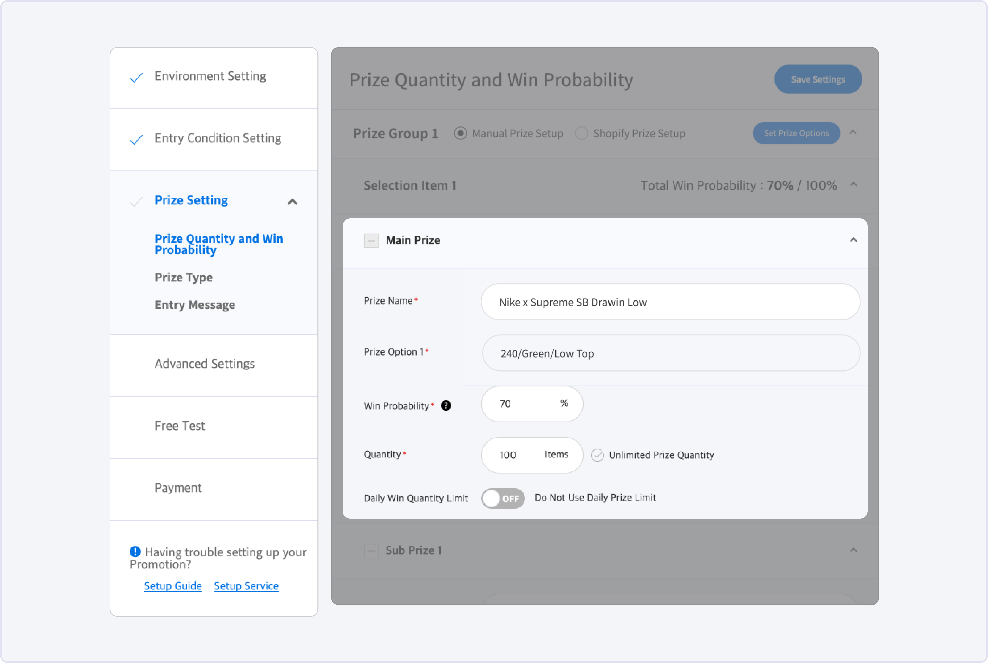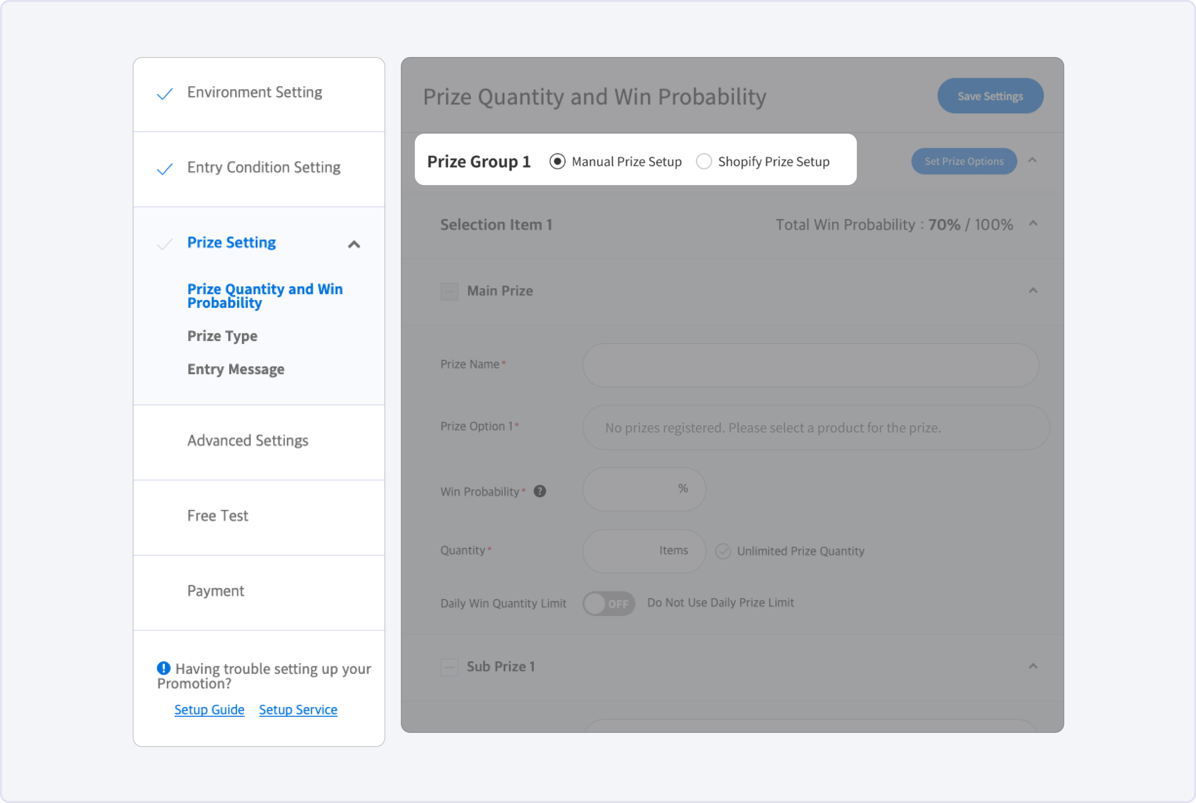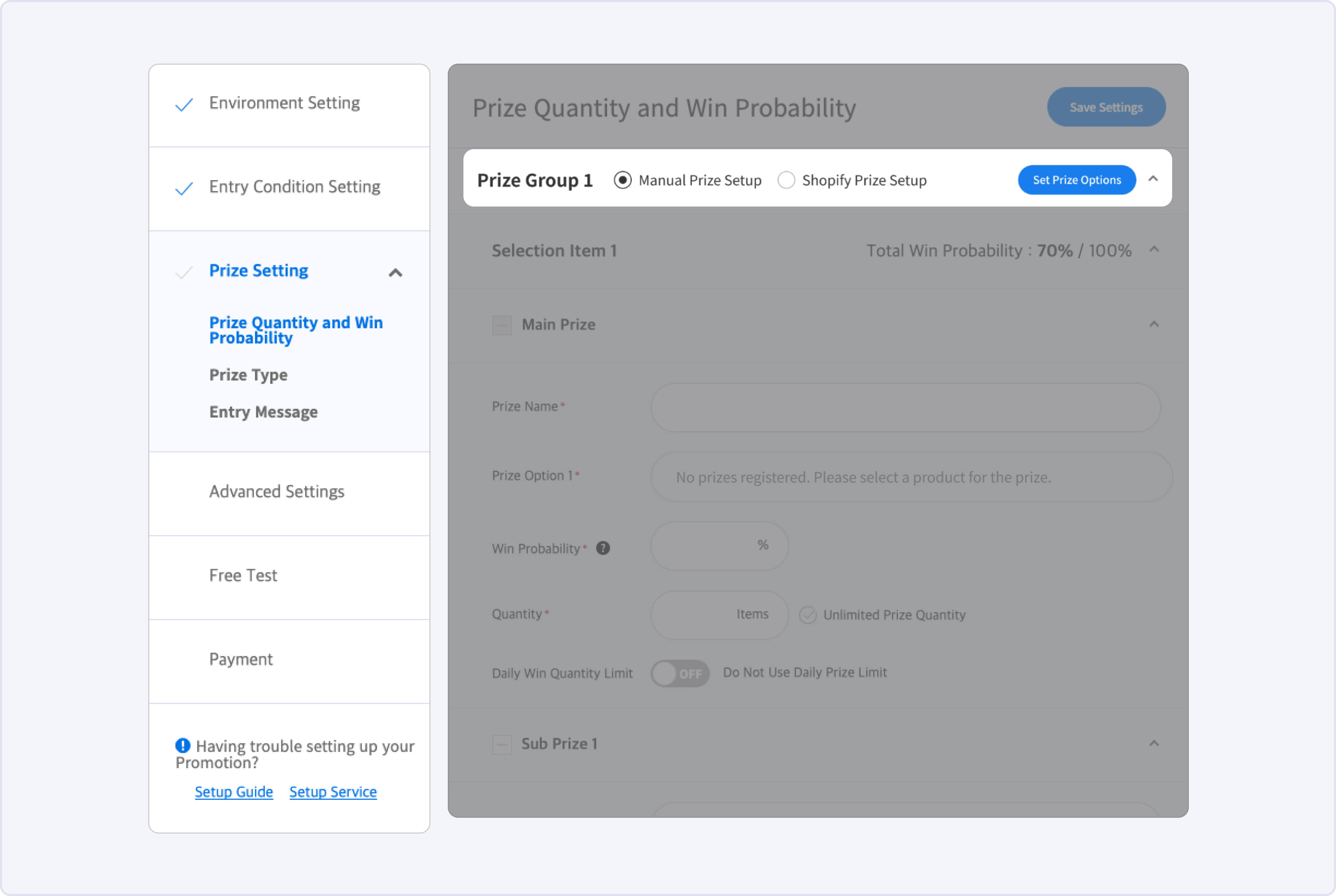 When conducting a raffle promotion based on Shopify integration, if prize options need to be registered, you can choose between the Direct Prize Setup and Shopify Prize Setup features.