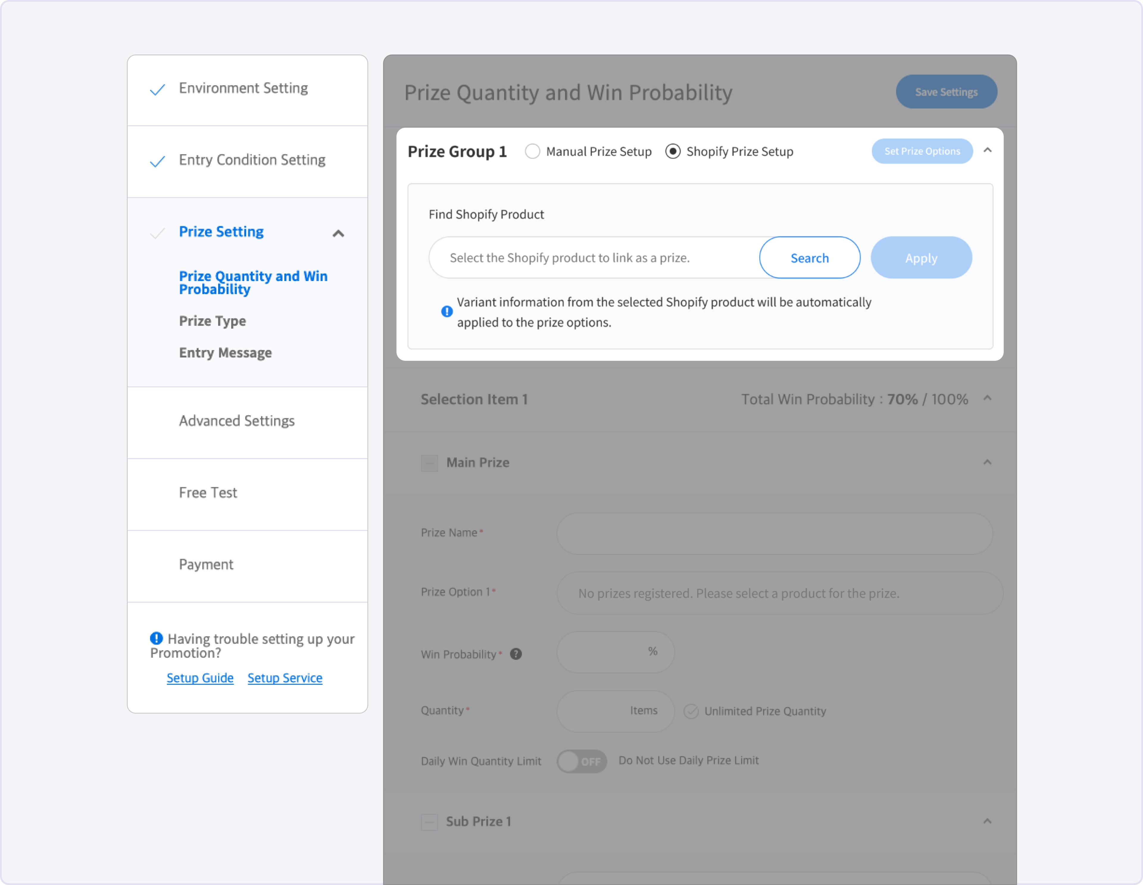 Using the Shopify Prize Setup feature allows you to automatically set the prize information (including options and selection items) registered in the connected Shopify store.