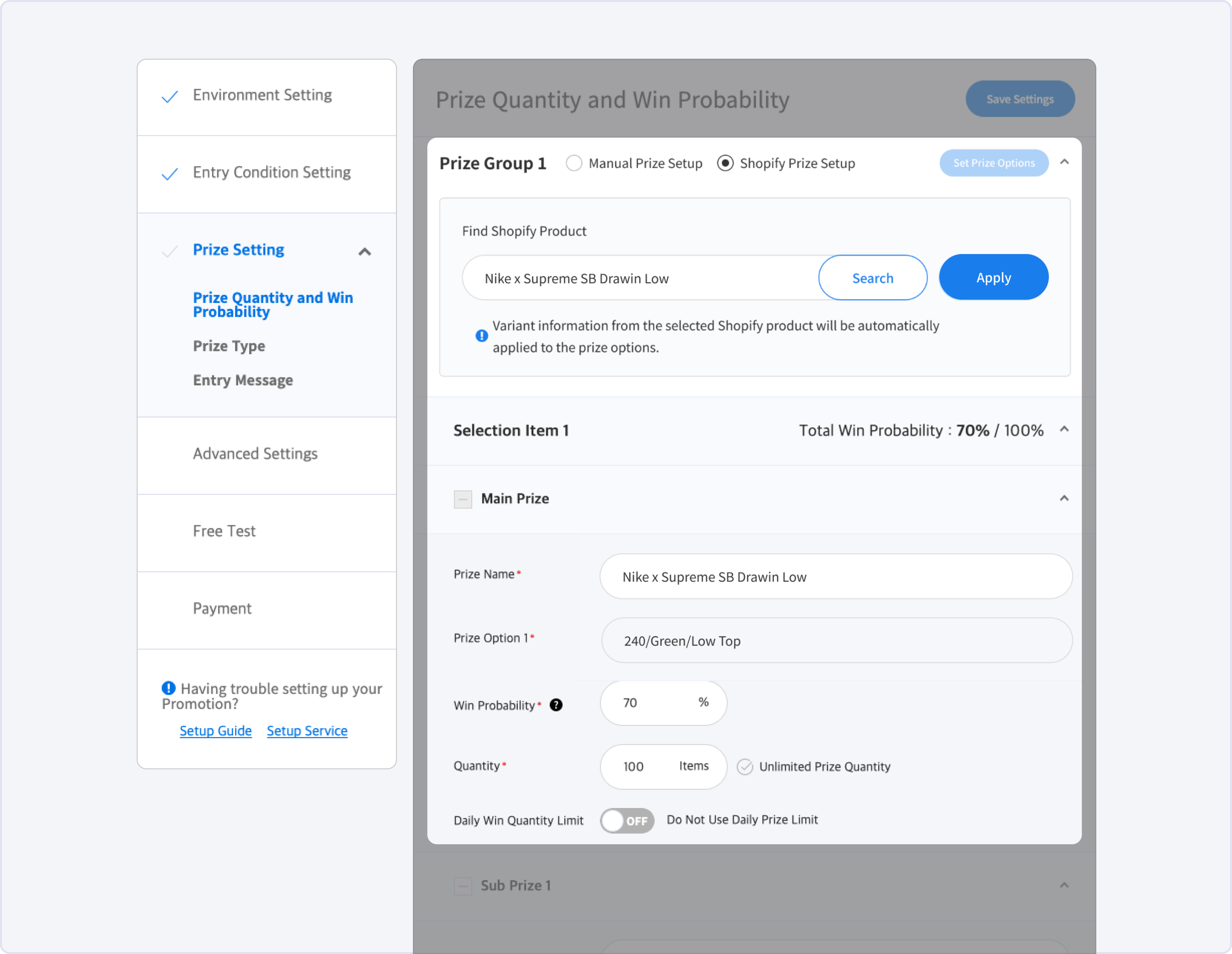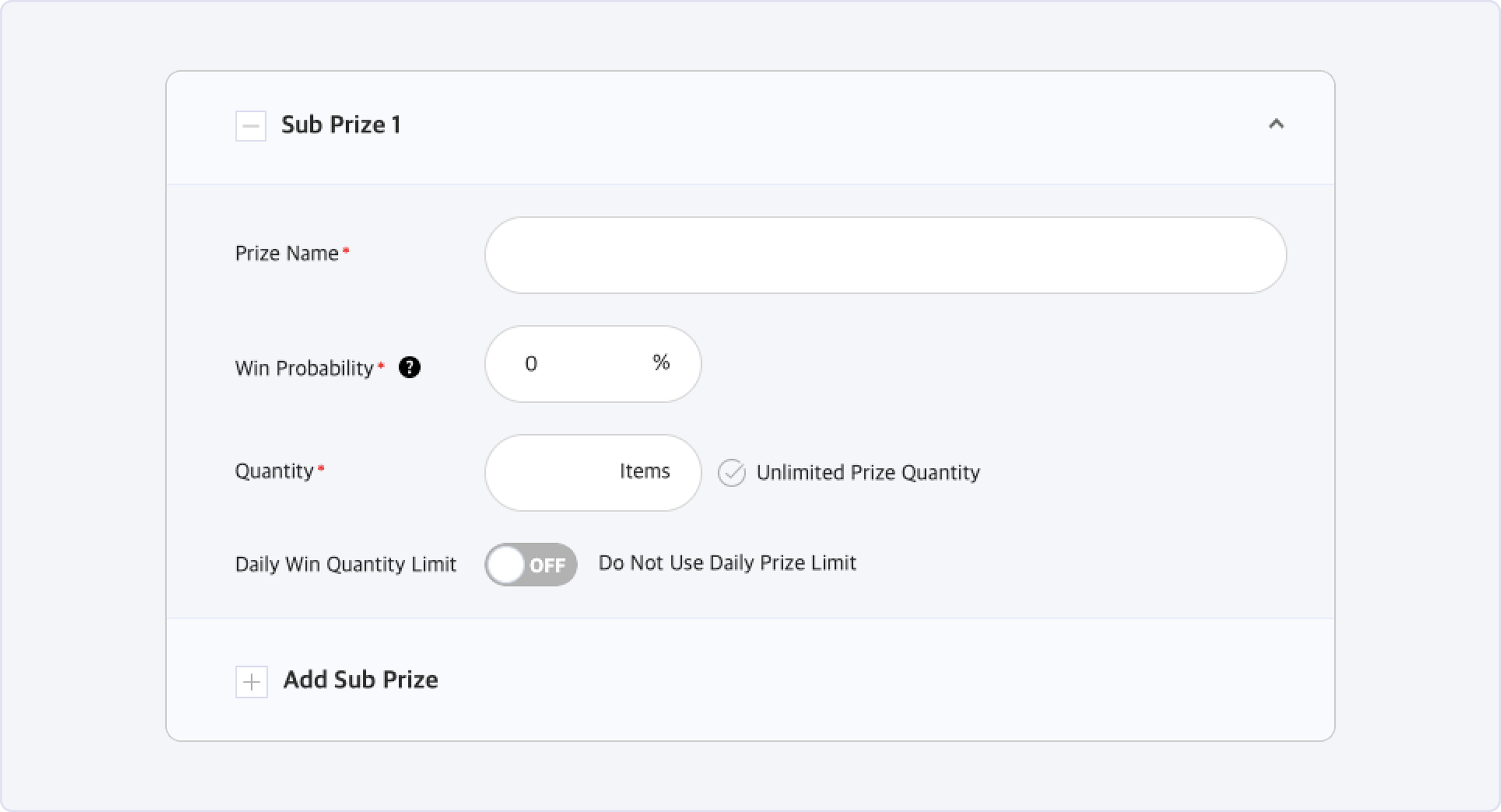 - Shopify Prize Setup: Retrieves product information from the connected Shopify store to link as prizes, making it easy to use products already registered in Shopify.
