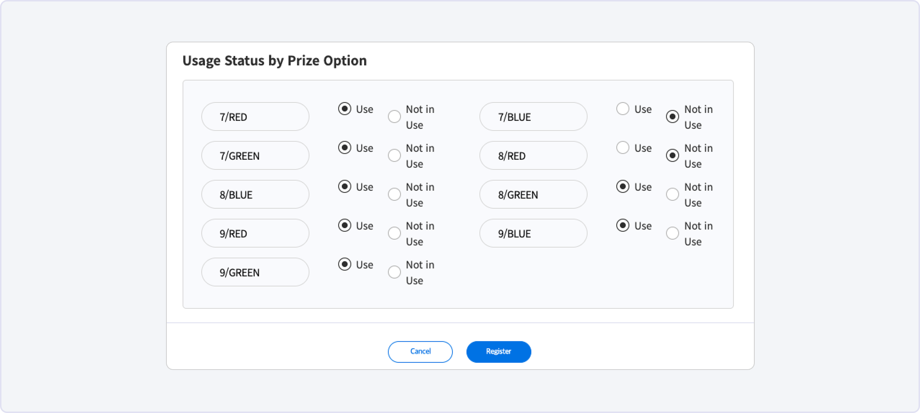 Click the Register button to automatically create prize groups in Prize Settings > Prize Quantity and Win Probability according to the selected items of the prize option.