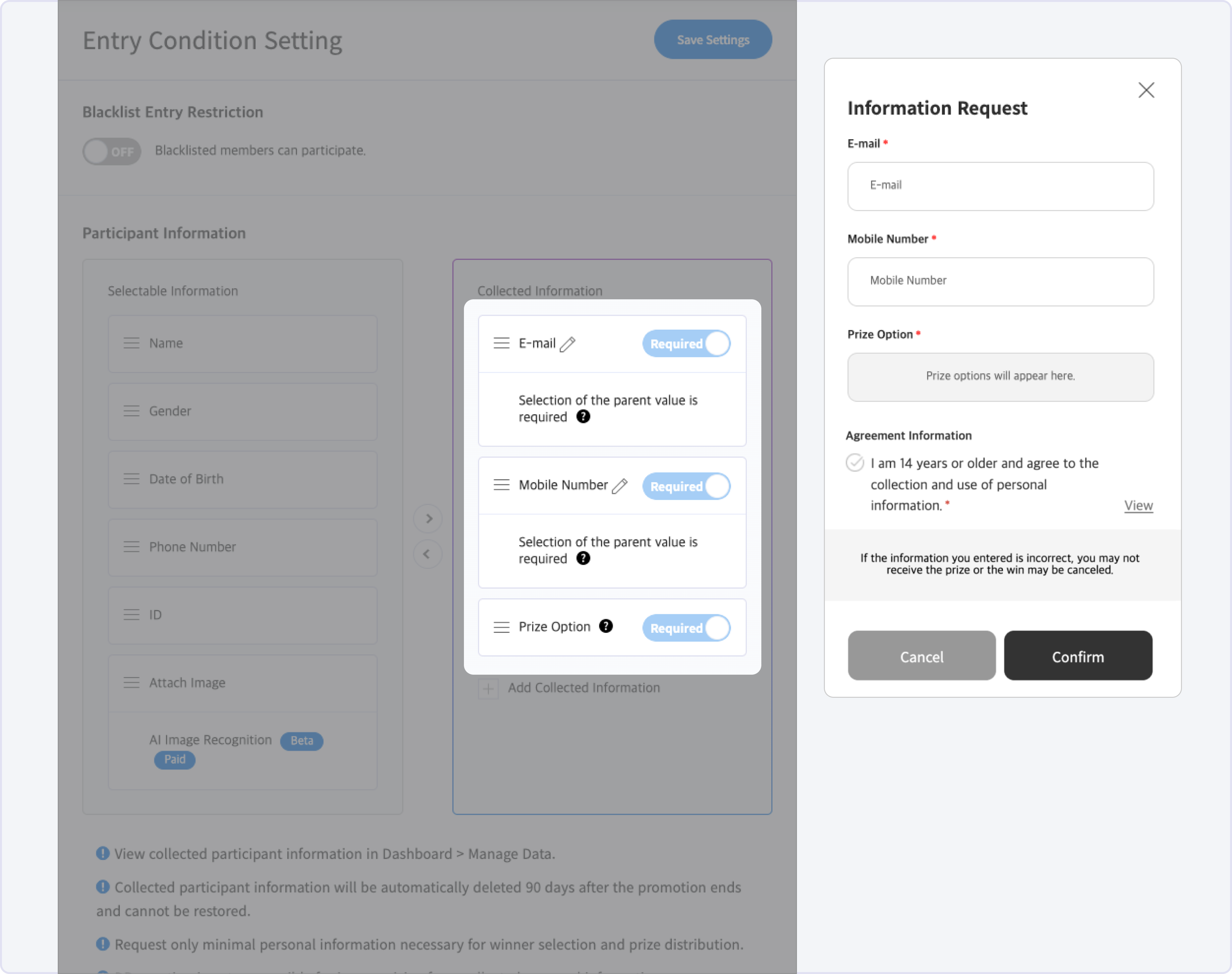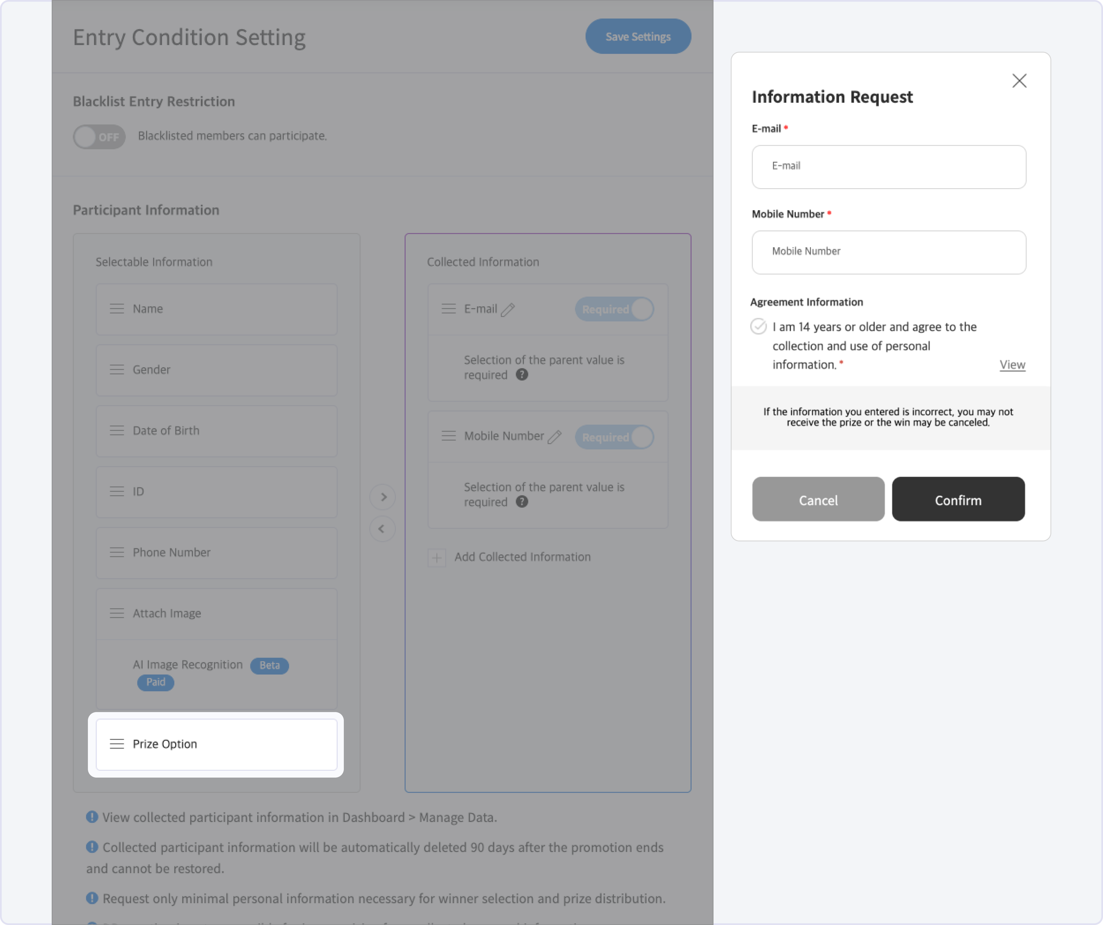 Prize options can be used only after adding Prize Options in Manage Promotion > Entry Conditions Settings under Participant Information.