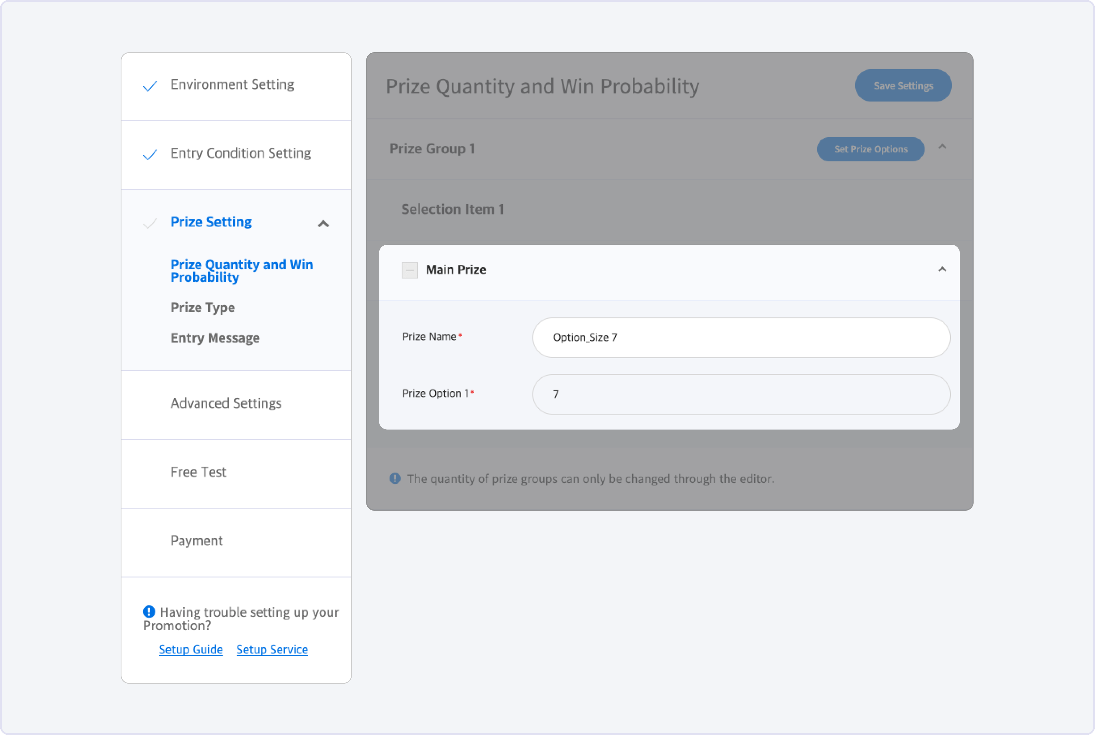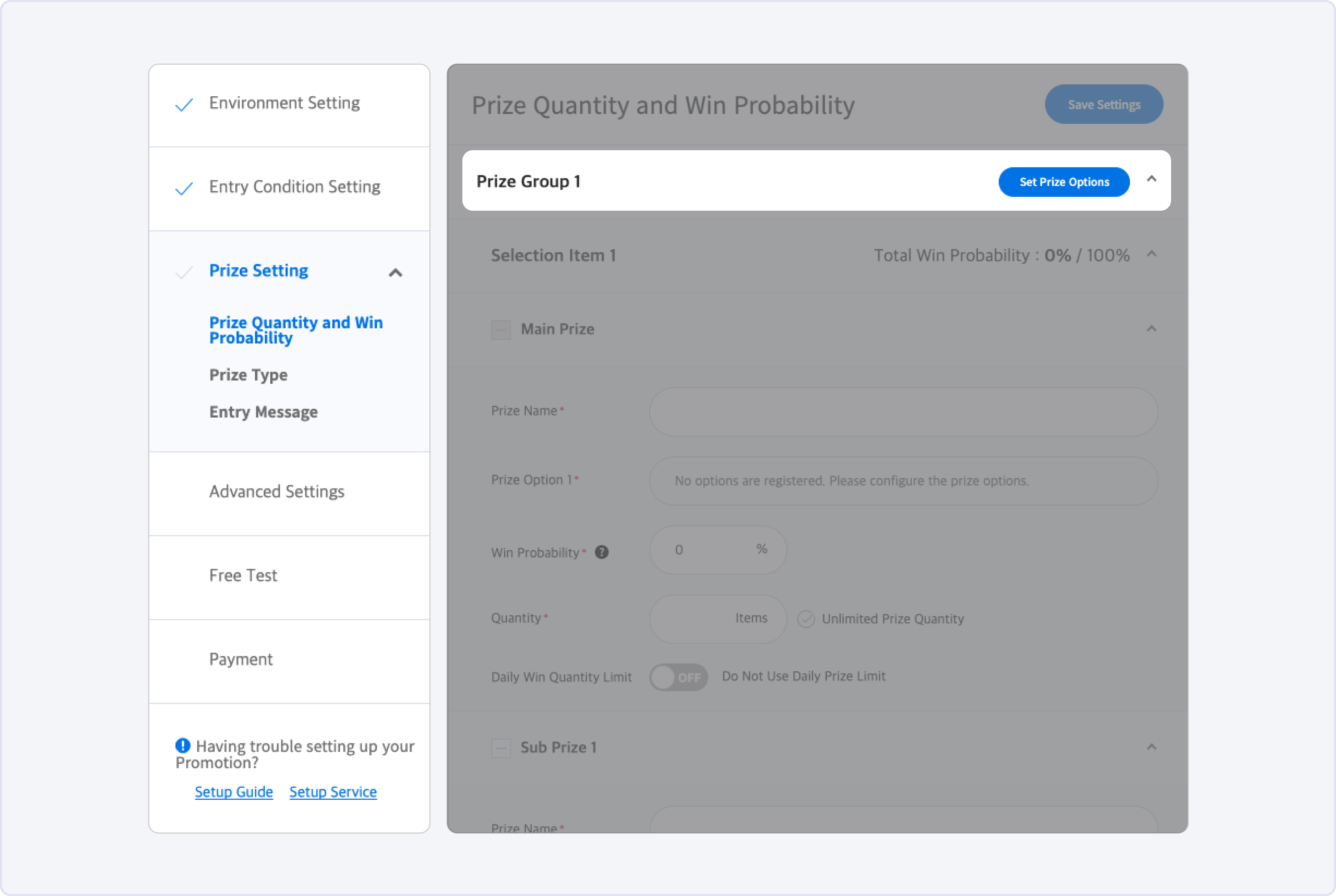 In Prize Settings > Prize Quantity & Winning Probability, click the Set Prize Options button.