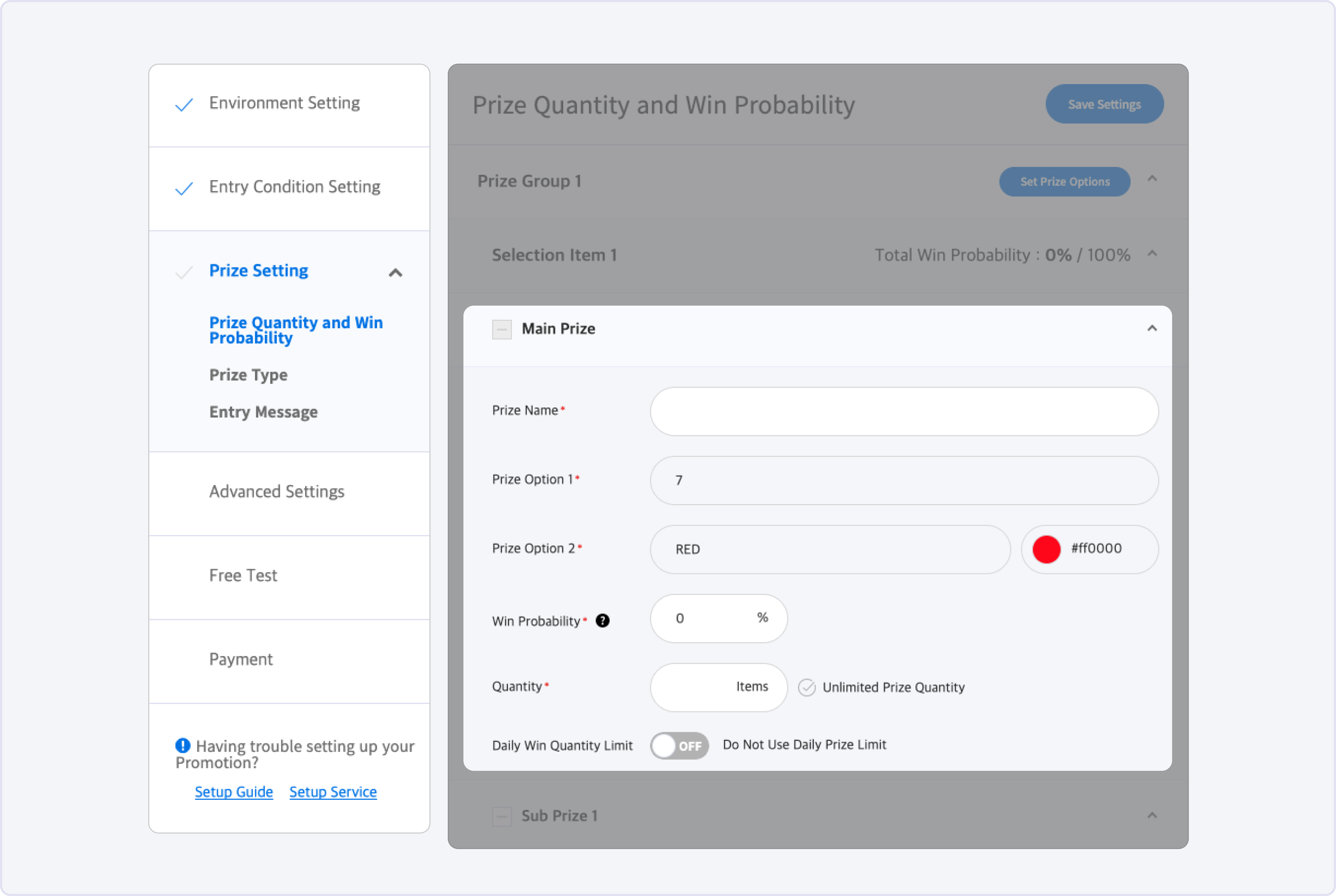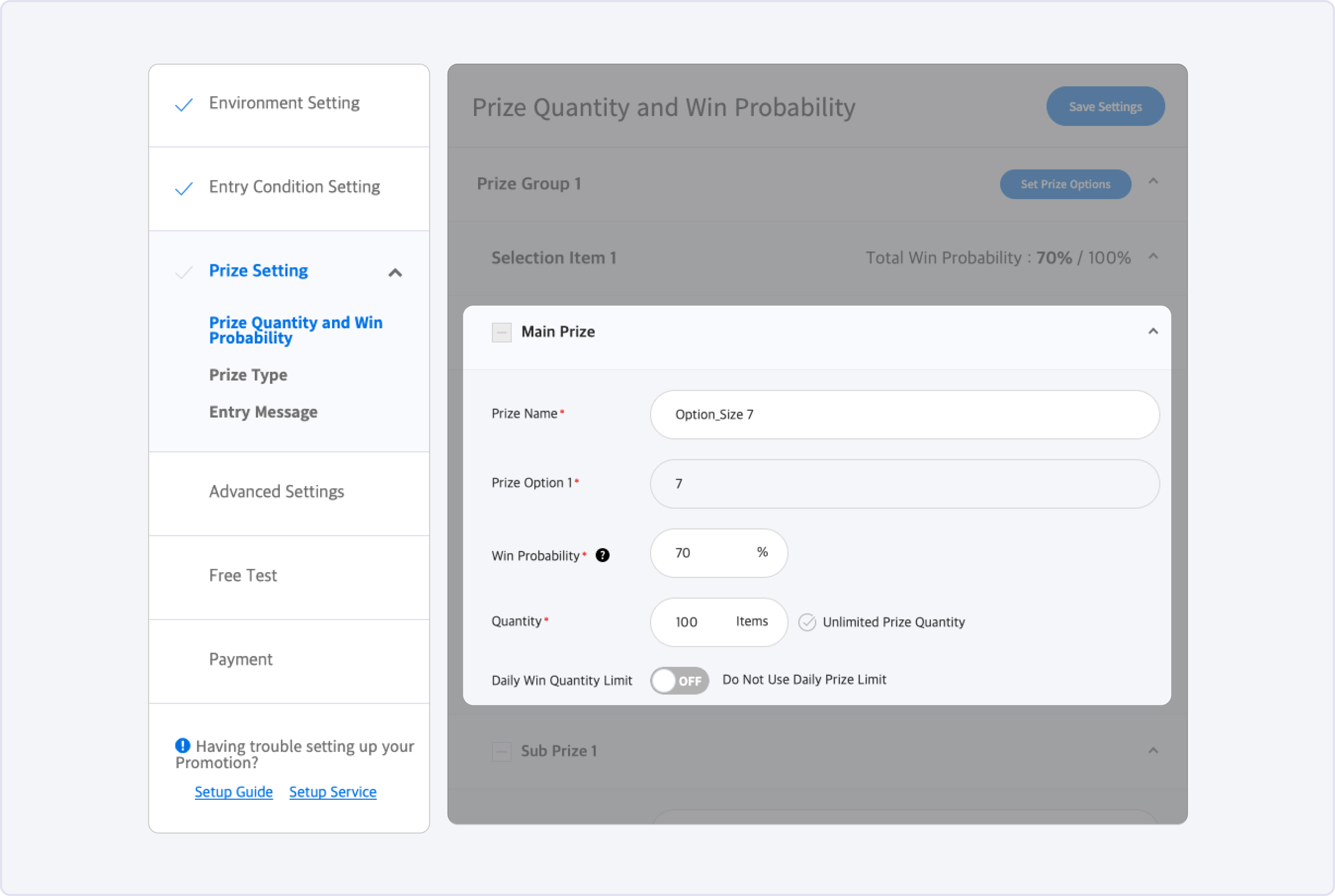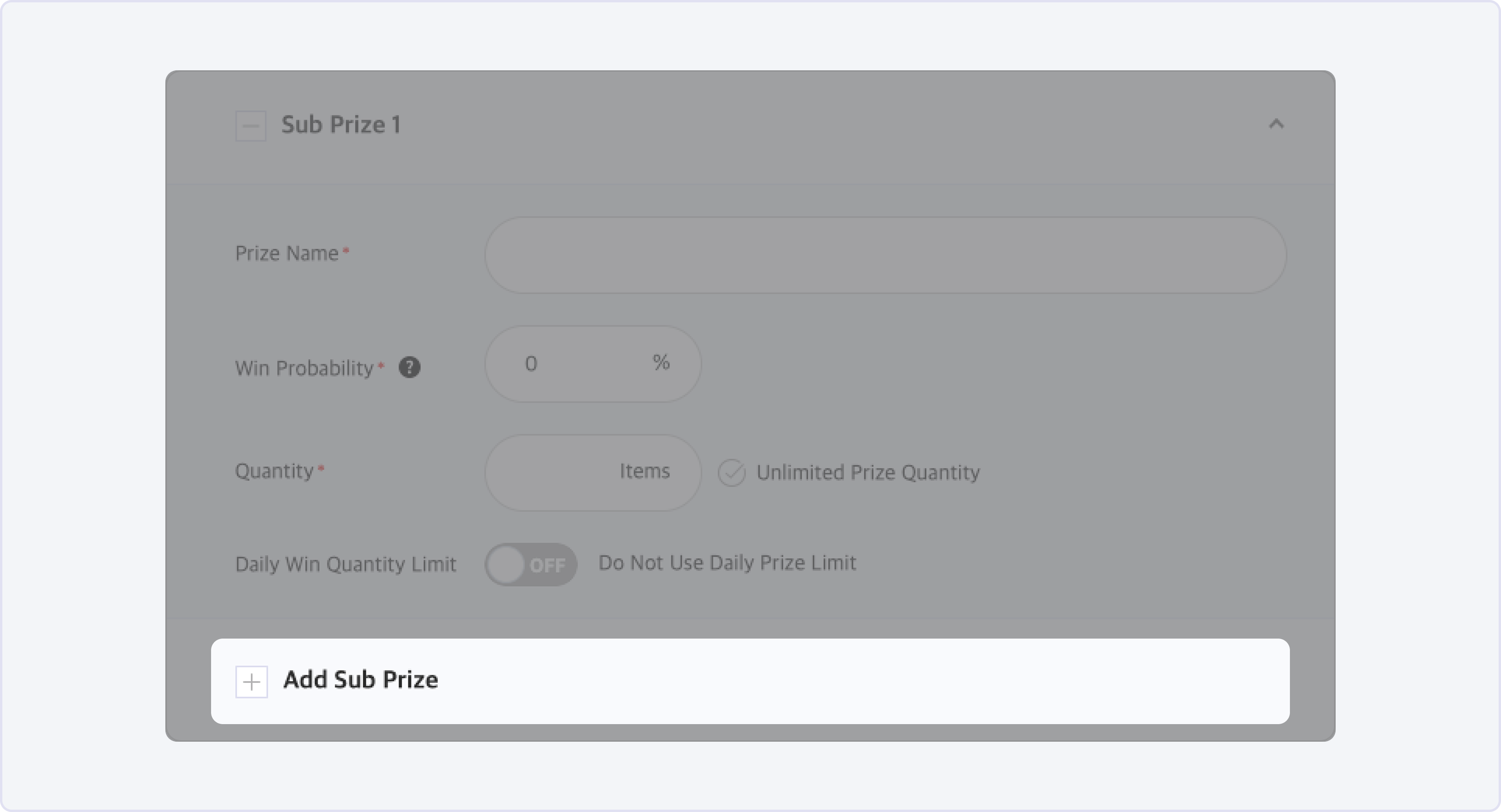 Setting the winning probability and quantity for each main prize is only possible if the Winning Notification Timing in Promotion Settings under Promotion Management is set to Notify Immediately Upon Entry.