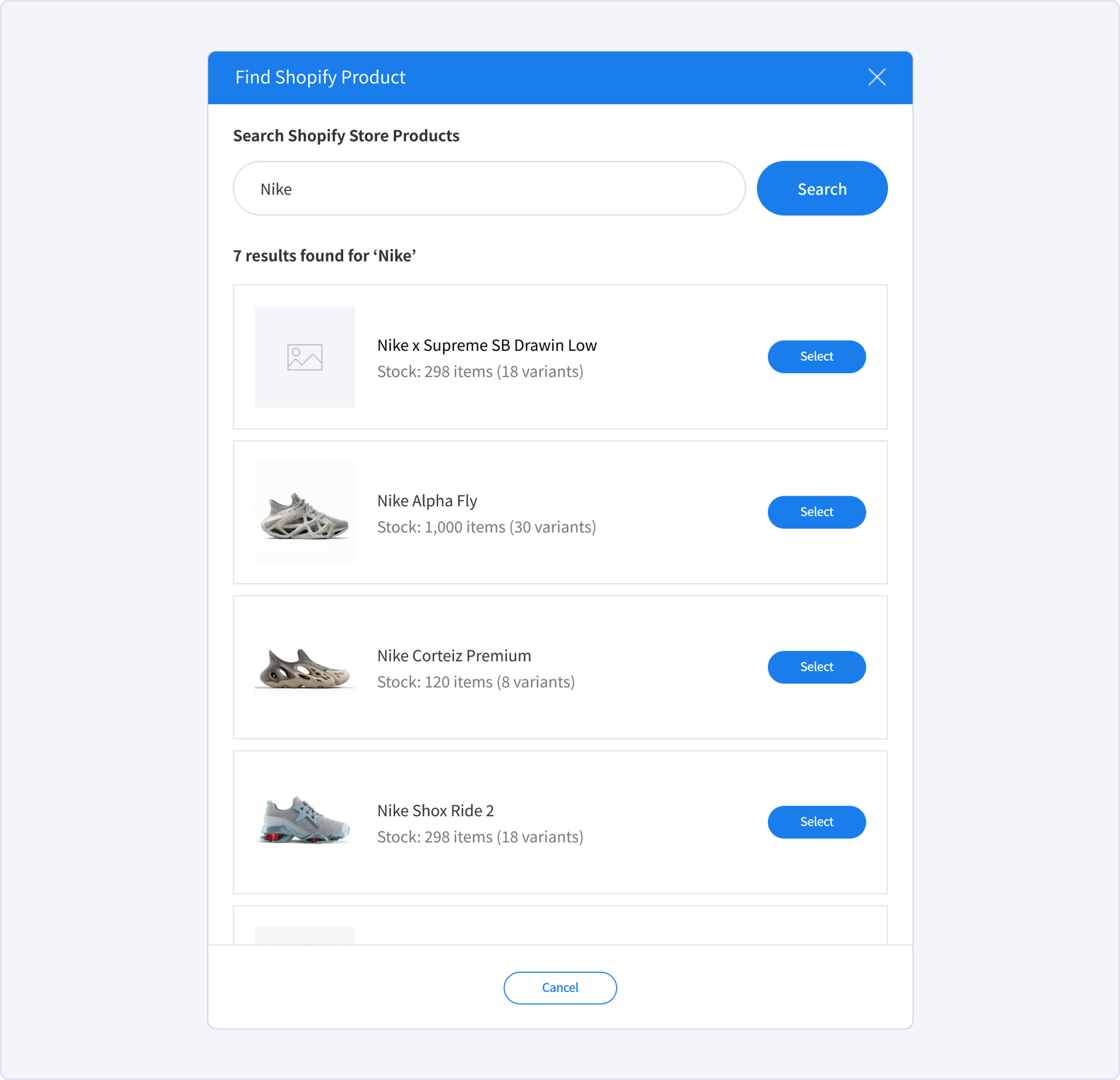 From the list of available products in the Shopify store search results, click the Select button for the product you want to register as a prize.