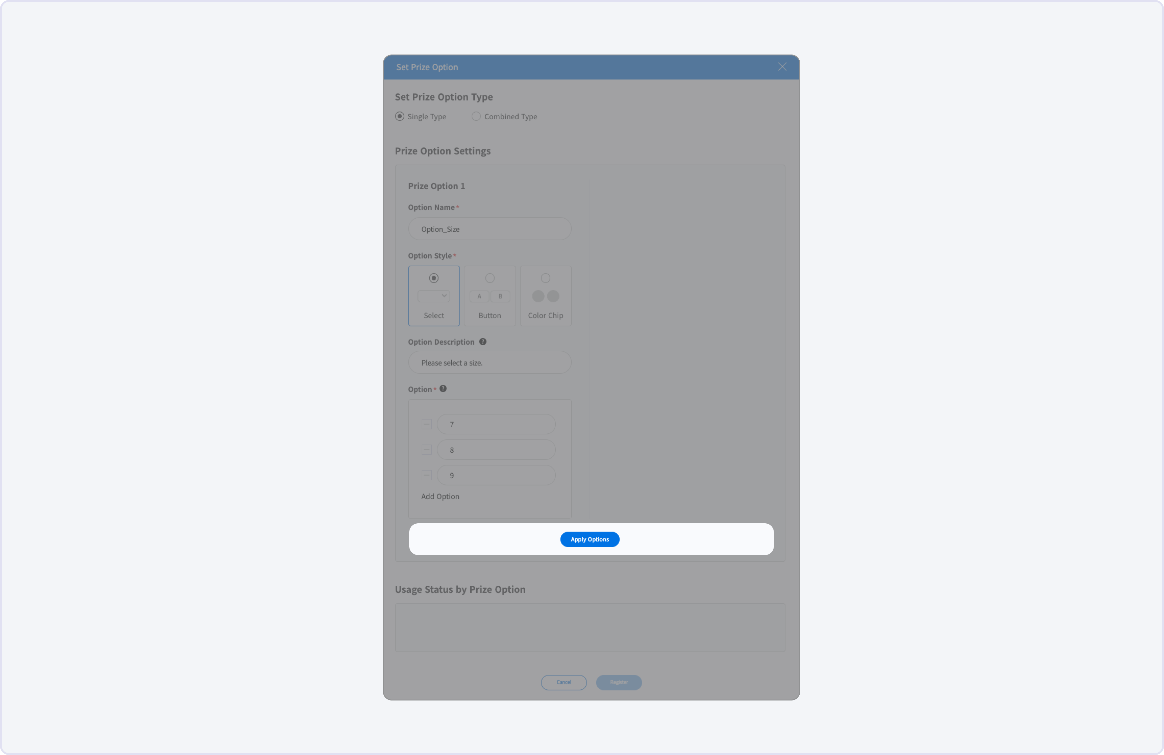 After setting all required values for prize option registration (Option Name, Option Style, Selection Items), click the Apply Options button.