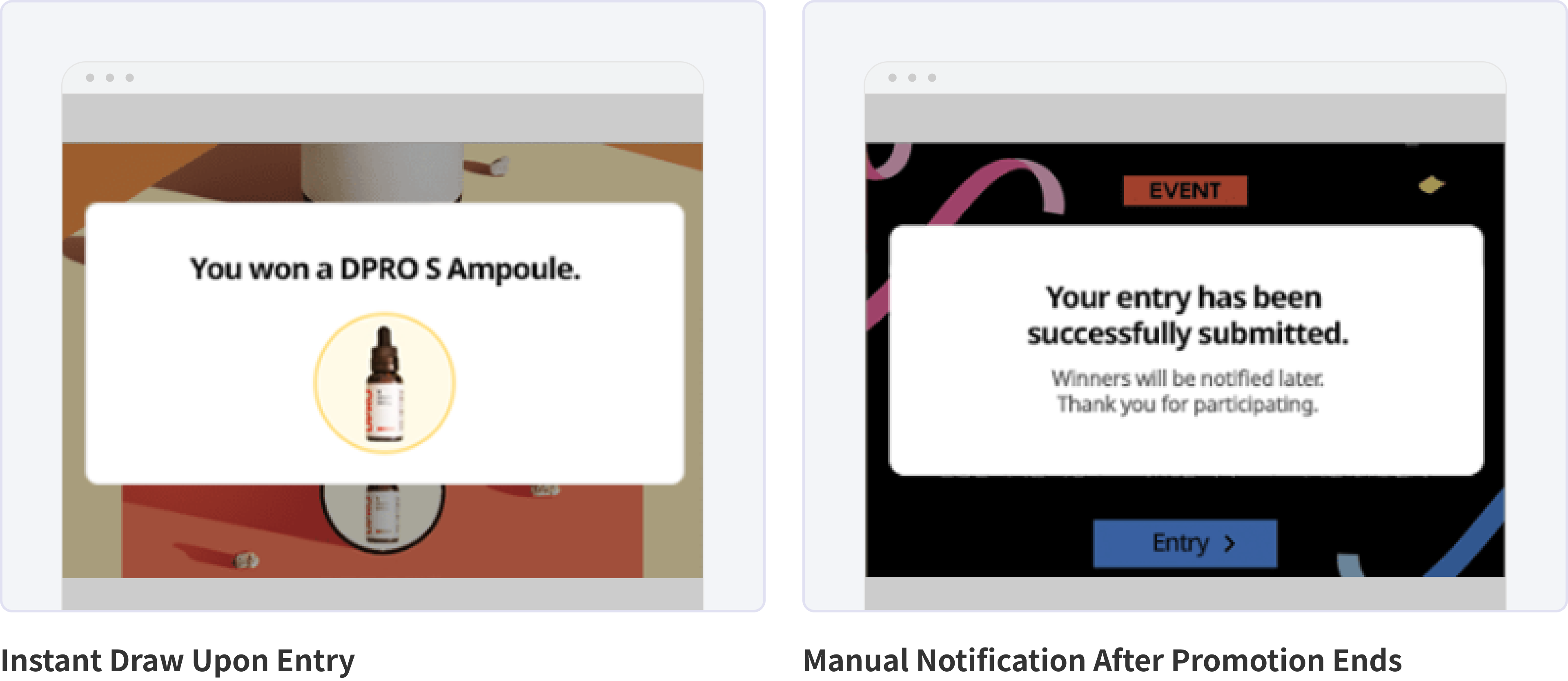 - Instant Draw Upon Entry : Check the Instant Notification (Pre-draw) guide in the Register Main Prize section below.